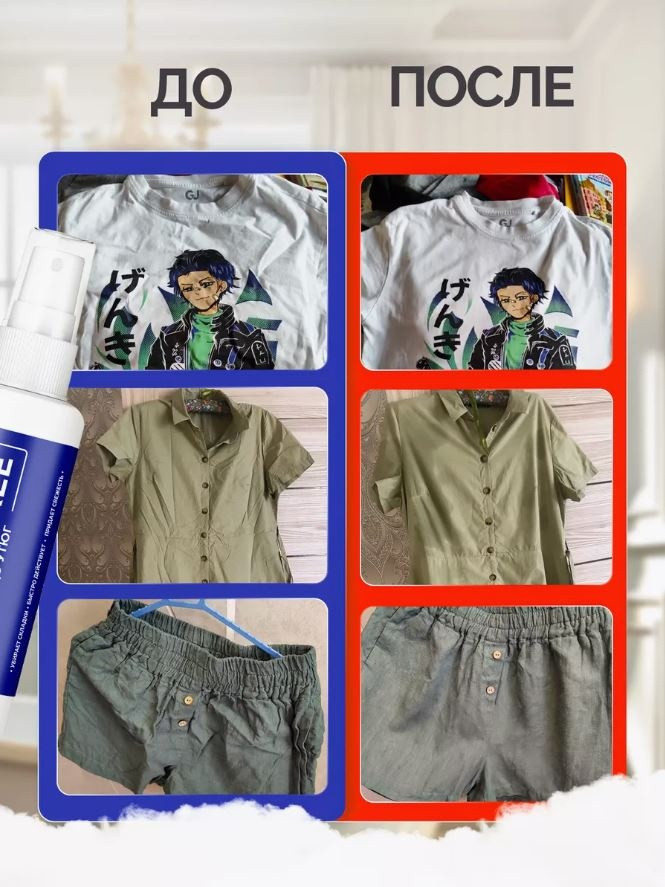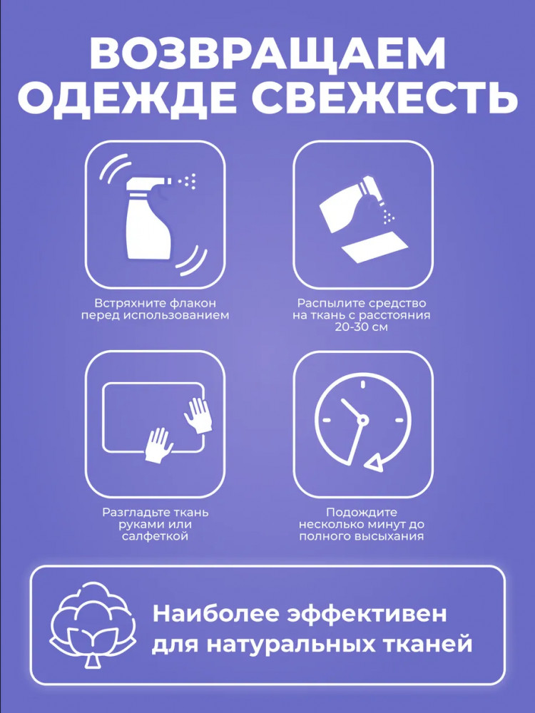 Способ применения: встряхните флакон. Распылите средство на одежду или другую ткань с расстояния 20-25 см. Расправьте скаладки руками. Дайте просохнуть изделию в течение 3-5 минут. Готово.