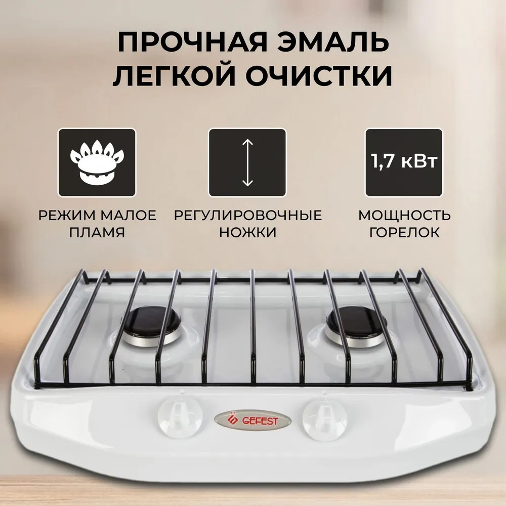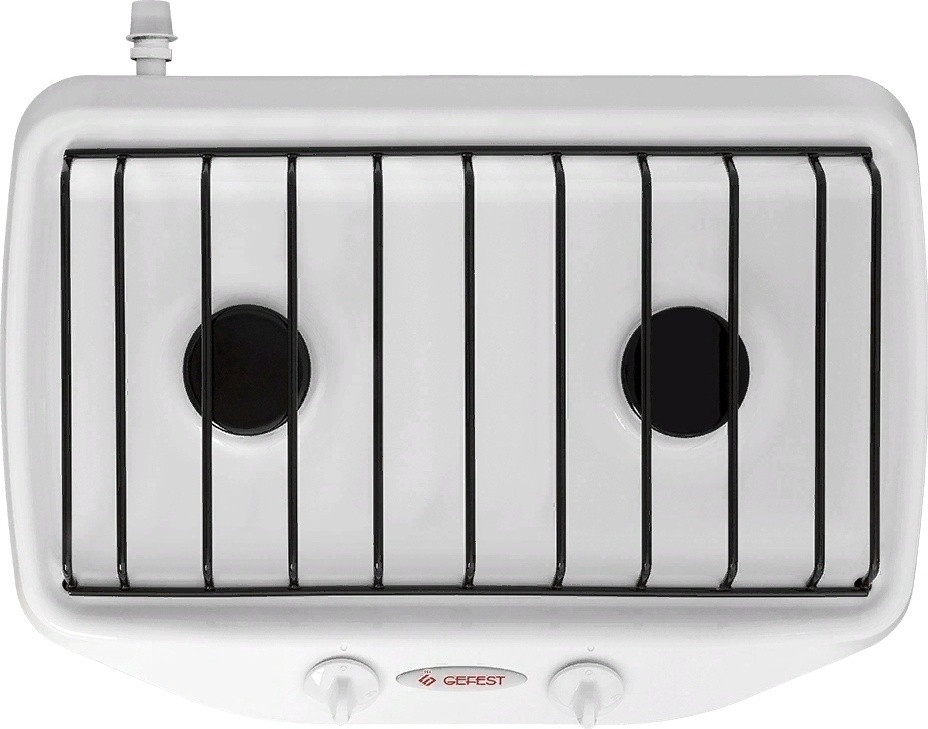 Настольная плитка — это компактное и экономичное решение для приготовления пищи. Она подключается к газовому баллону, что позволяет использовать топливо, которое стоит дешевле электроэнергии. Плитка имеет небольшие размеры, что делает её удобной для установки на даче. Фиксированное положение «малое пламя» дает возможность идеально приготовить еду на медленном огне. Газовая настольная плитка Gefest 700-02 подойдет для загородного участка или небольшой квартиры. Она не займет много места, габариты этой модели равны 50×10×37 см. Поверхность плитки изготовлена из эмалированной стали, оформленной в белом цвете. Она прослужит долго, легко моется и неприхотлива в уходе. Термостойкое эмалированное покрытие надежно и долговечно. С него легко отмыть жир, а скачки температуры ему не страшны. Газовая плитка Gefest 700-02 оснащена двумя конфорками. Управлять работой устройства можно с помощью поворотных переключателей.