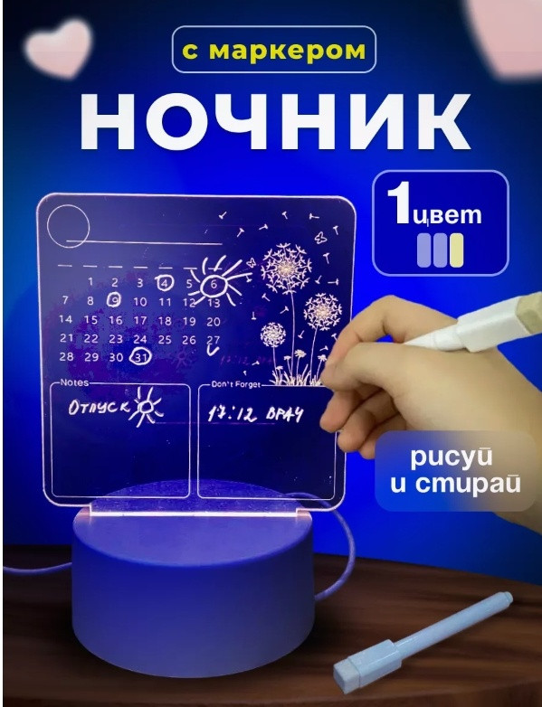 💳 Оплатить за товар можно при получении 🇰🇿 Есть бесплатная доставка по Казахстану от 1 дня 🎁 Копите бонусы с каждой покупки Ночник с маркером для рисования 3D — удивительный подарок, который запомнится вашей дочке или сыну на день рождения или 8 марта. Этот светодиодный светильник не только станет прекрасным декором для детской комнаты, но и позволит ребенку создавать красивые рисунки прямо на ночнике при помощи специального маркера. |