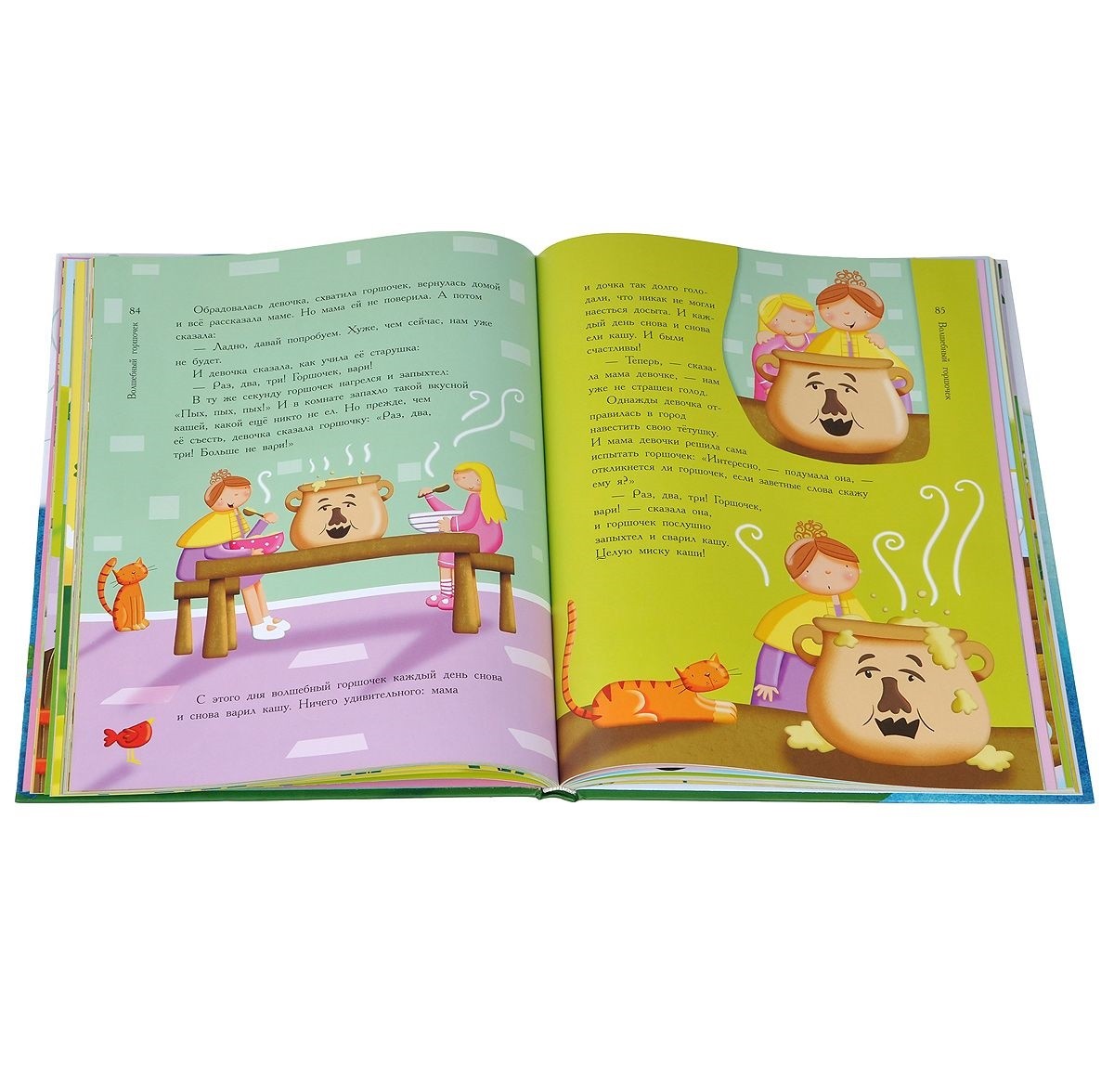 Эту книгу можно заказывать как подарочную, потому что оформление выше всяких похвал: очень качественные листы, переплет, яркие иллюстрации, много сказок. Дочке 4 года и она в восторге. Единственное замечание, текст сказок не оригинал, а скорее по мотивам и может немного отличаться от общепринятого. В общем всем советую.