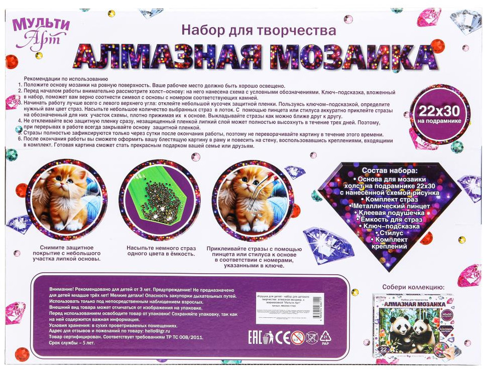 При помощи этого набора маленький художник сможет создать красивую картинку-мозаику, декорированную сверкающими стразами. Яркую блестящую поделку можно подарить близким или использовать для украшения комнаты.