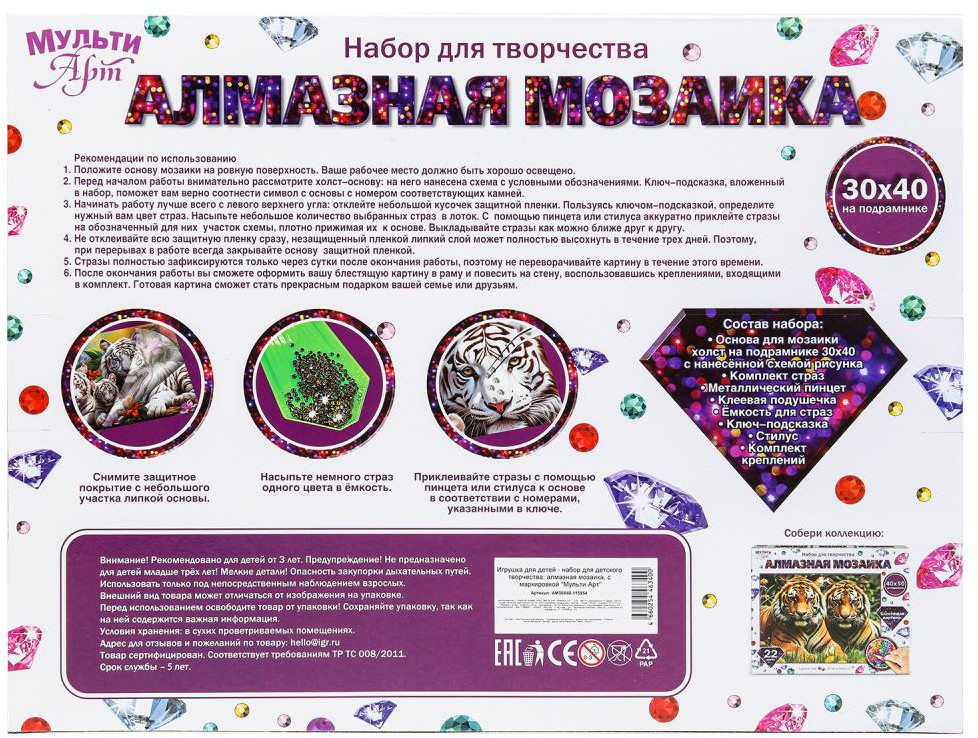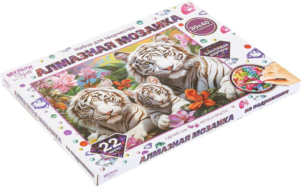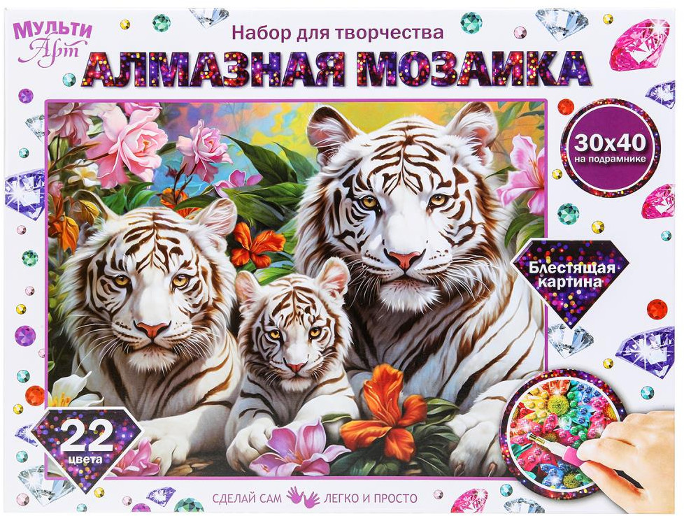 Набор для детского творчества — алмазная мозаика «Белые тигры» ТМ «Мульти Арт» — отличный подарок для ребёнка, который будет способствовать развитию его творческих способностей. |