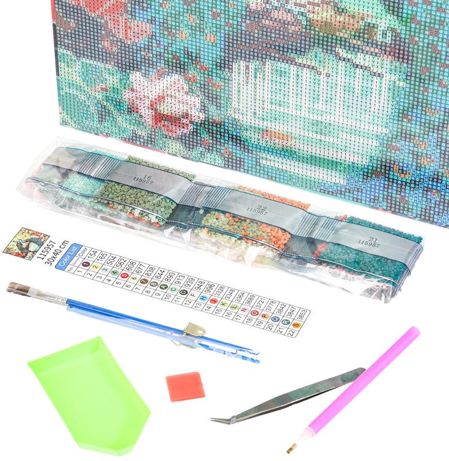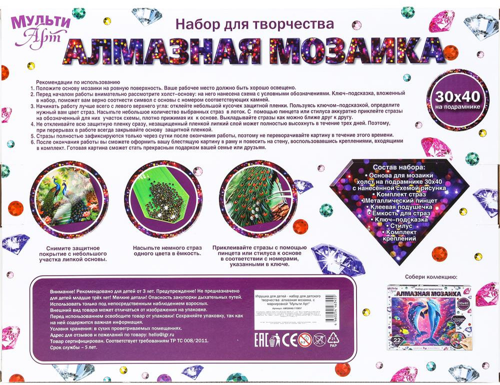 При помощи этого набора маленький художник сможет создать красивую картинку-мозаику, декорированную сверкающими стразами. Яркую блестящую поделку можно подарить близким или использовать для украшения комнаты.