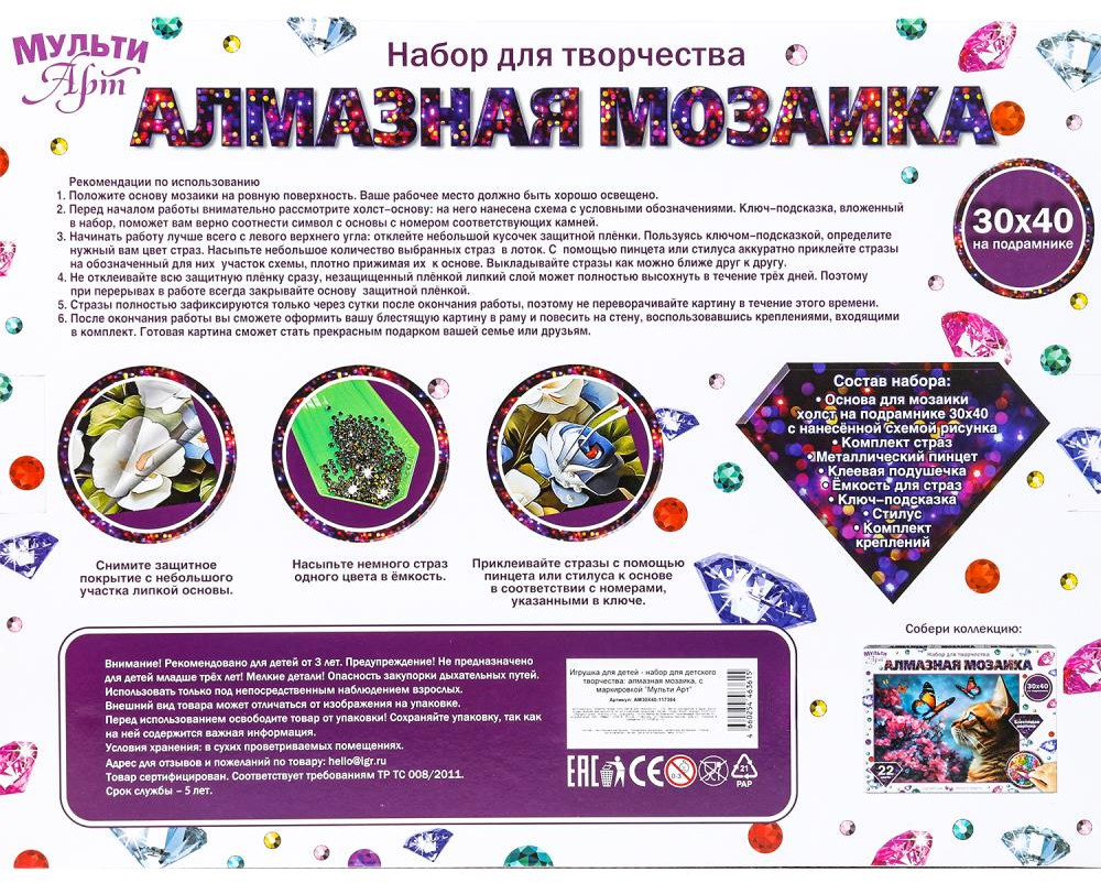 При помощи этого набора маленький художник сможет создать красивую картинку-мозаику, декорированную сверкающими стразами. Яркую блестящую поделку можно подарить близким или использовать для украшения комнаты.