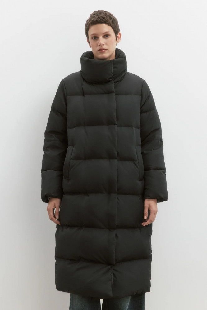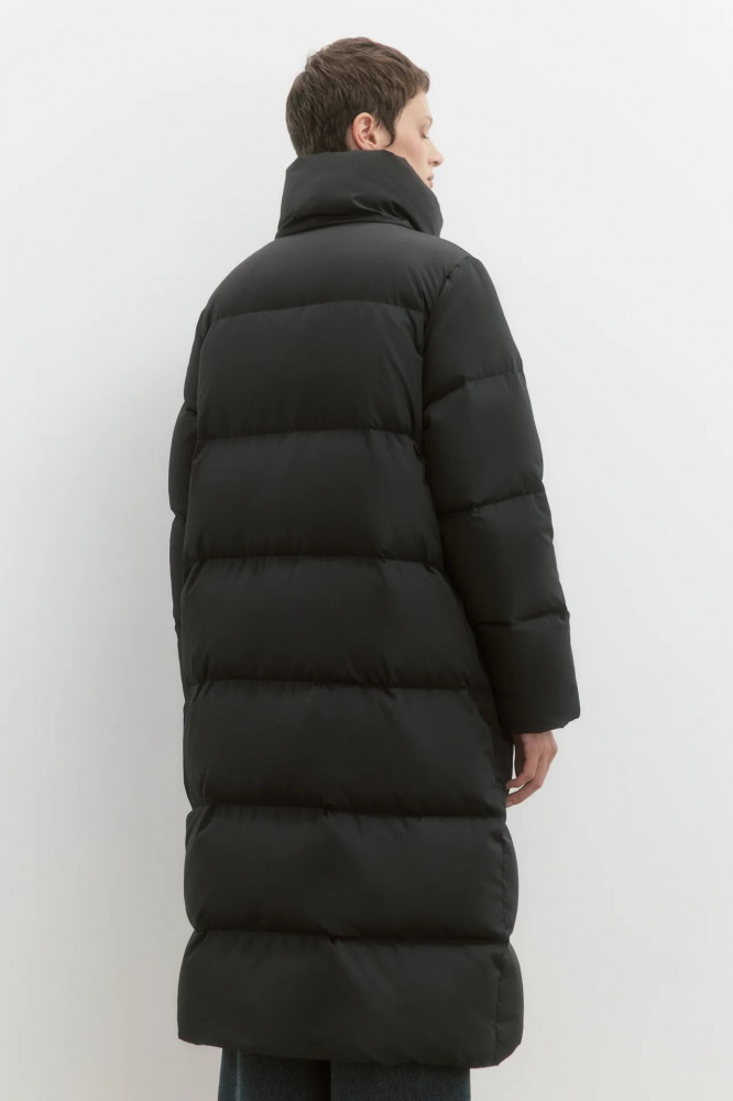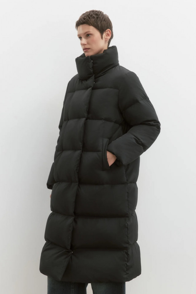 Длинная женская стеганая куртка свободного кроя из ткани с плащевой фактурой с натуральным утеплителем (пух 50%, перо 50%). Высокий воротник-стойка без капюшона, который при желании (или когда станет жарко) можно носить, как отложной. Застежка на планку с кнопками по всей длине. Длинные рукава с присборенными манжетами и спущенной линией плеча. Два боковых прорезных кармана без застежки. Прямой нижний край без утяжек.