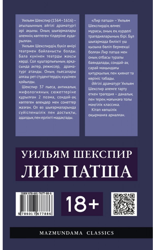 💳 Оплатить за товар можно при получении 🇰🇿 Есть бесплатная доставка по Казахстану от 1 дня 🎁 Копите бонусы с каждой покупки Серия: mazmundama classics Шекспирдің атақты трагедиясының бұл нұсқасында негізгі оқиғалар тақталас, ұрпақтар арасындағы қарама-қайшылықтар, яғни өнердегі классикалық тақырыптардың бірі — әкелер мен балалар қарым-қатынасы төңірегінде өрбиді. Бүкіл елін ашса алақанында, жұмса жұдырығында ұстаған Лир патшаның ақыры неге бұлай болды? Адам бойындағы махаббат пен ғадауат, адалдық пен сатқындық, риясыздық пен ашкөздік тайталасы салқынқанды зерделенетін қойылым авторлары бұл сауалға көрермендерімен бірлесе отырып жауап іздейді... |