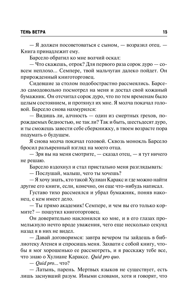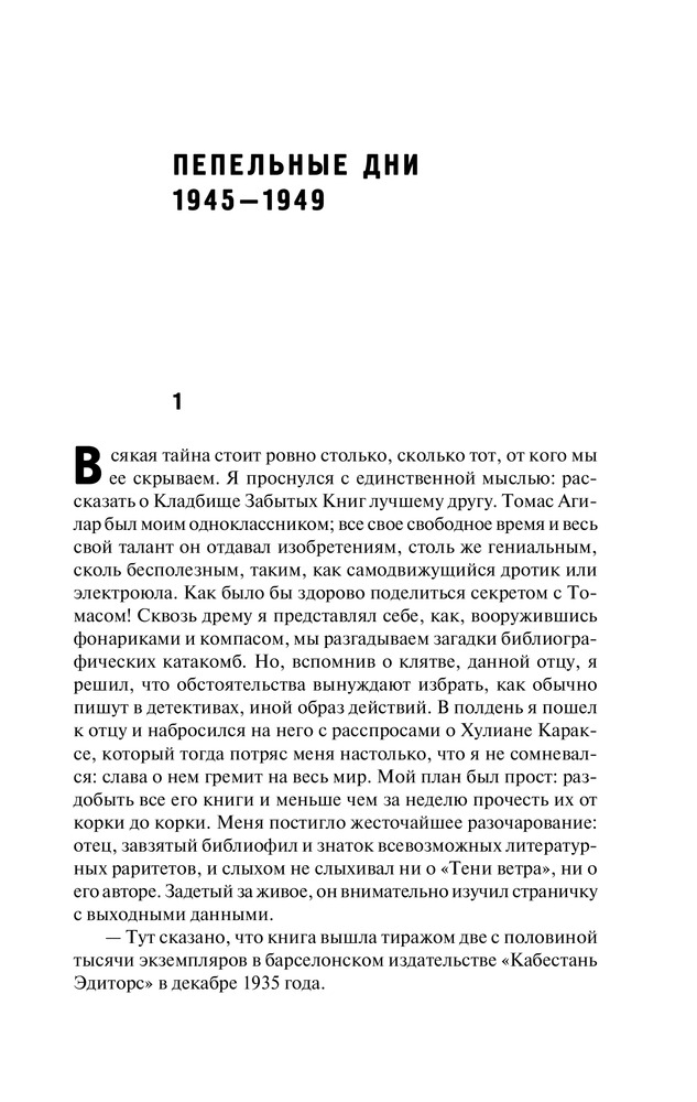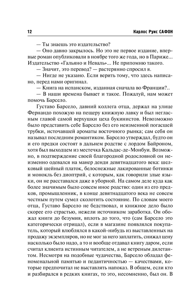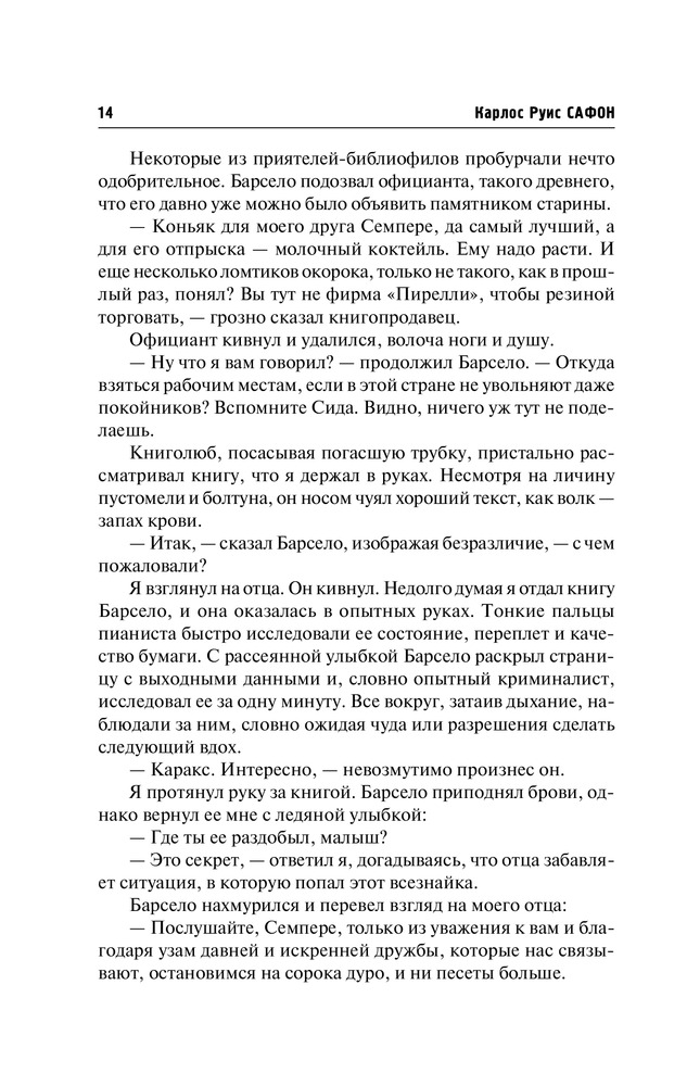 Мрачный волшебный роман испания, барселона, книги, любовь, надежда и красивый слог. автор покорил мое сердце знаю, что не каждому душе жанр «магический реализм», немного сентиментальные и атмосферные произведения. но это моё! я погрузилась в мир хулиана каракса, гнетущий, но чарующий. мир, которым правит любовь вопреки. ох, эти женщины!) дай им красивую сказку о чувствах, тают на глазах но здесь нет сказки. просто история. история о людях, их взаимоотношениях, привязанности, трусости. и очень красивые метафоры, аллегории, описания. представляю, как чувственно все это читается на испанском.