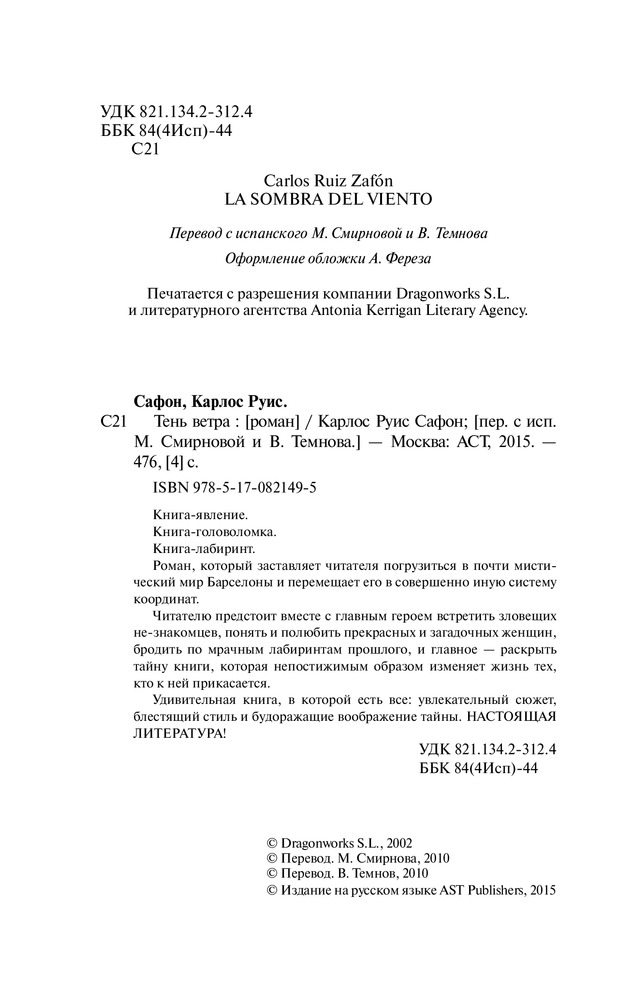 Впервые прочитал этого автора, для меня все испаноязычные писатели и их произведения - как просмотр телесериала, когда мы были маленькими, интересные сюжеты, сложные семейные отношения, внезапные повороты и перипетии судеб, страсть, романтика, страх, мистика все это есть в испаноязычных романах. «Тень ветра» не исключение, читайте не пожалеете!
