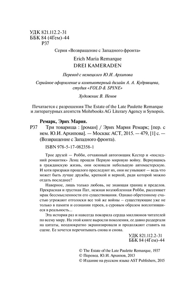 Максимально разочарована качеством бумаги. Книга не закрывается полностью, так как листы идут «волной», и так все три заказанные мной книги Ремарка этой серии от издательства АСТ.