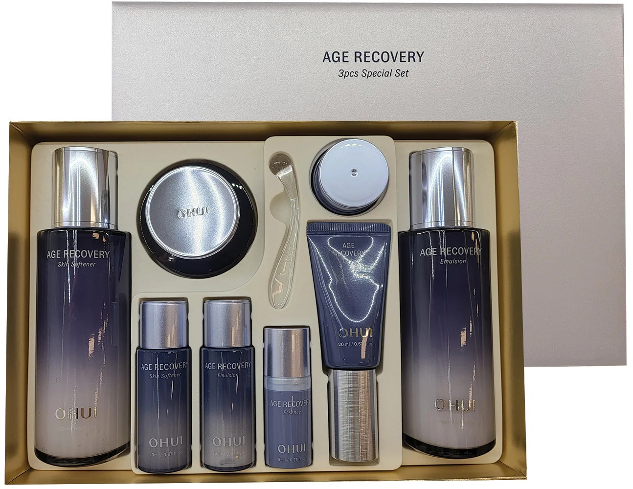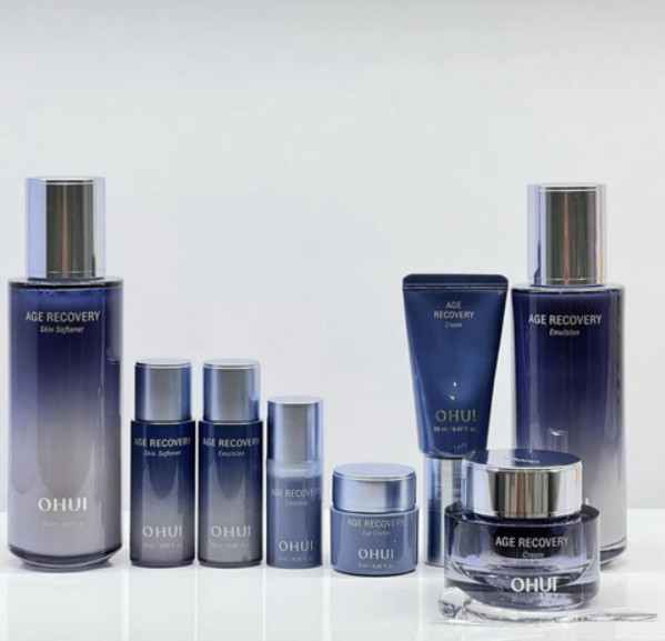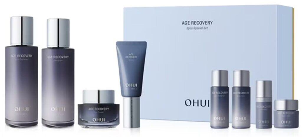 Age recovery essence: purified water, dipropylene glycol, dimethicone, bis-peg-18methyletherdimethylsilane, glycerin, sorbitol, triethylexanoin, pca dimethicone, butylene glycol, polyglyceride. Lil-3methy|glucose distearate, trehalose, glyceryl stearate, 1,2-hexanediol, niacinamide, panthenol, peg-100 stearate, behenyl alcohol, c14-22 alcohol, squalane, irish moss extract, japanese knotweed root extract, titanium dioxide (ci 77891), mica, denatured alcohol, adenosine, stearic acid, trisodium edta, carbomer, ceramide np, red iron oxide, nutmeg extract, tangerine extract, toco ferrol, hesperidin, pyridoxine hcl, sunflower seed oil, sodium lactate, polysorbate 20, beta-carotene, carrot extract, carrot seed oil, desamidocollagen, glycine, hydroxyproline, palmitoyl tripeptide-1. Proline, palmitovl tetrapeptide-7, limonene, linalool. Hexyl cinnamal. Benzvl salicylate.
