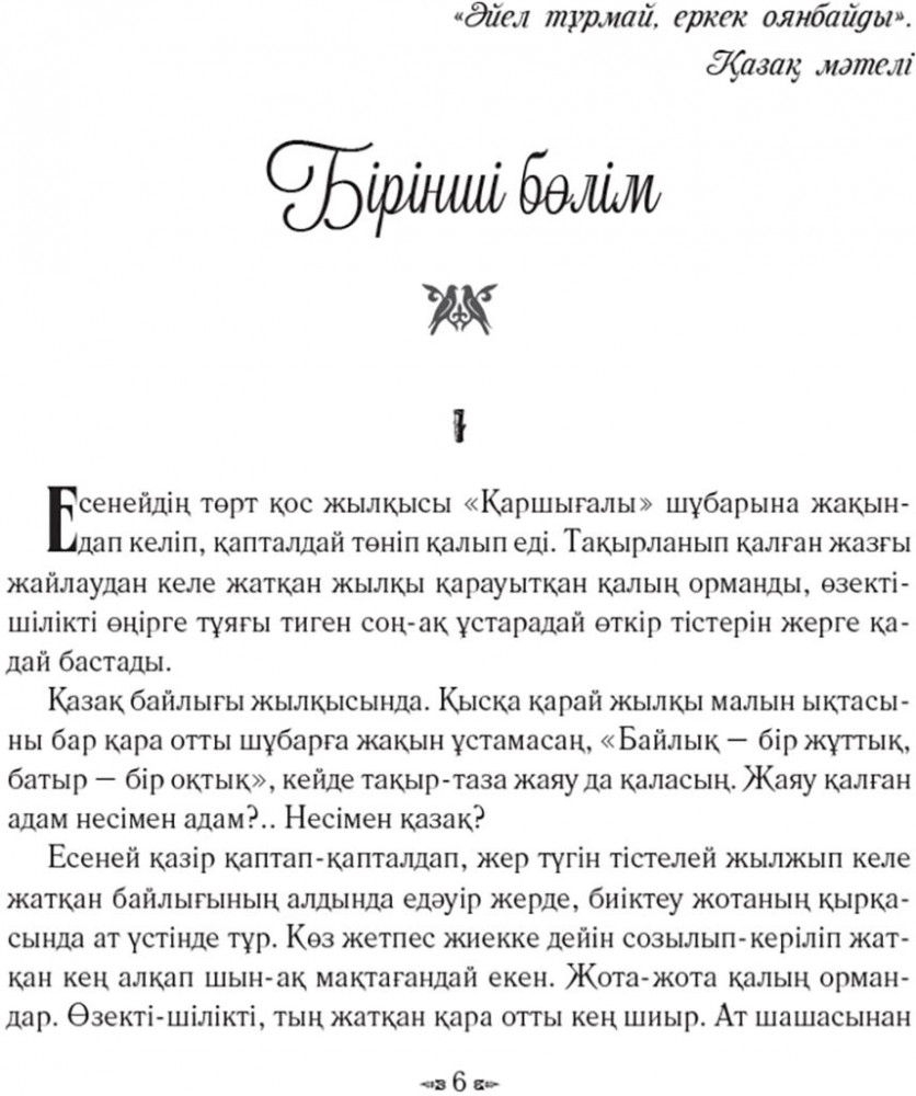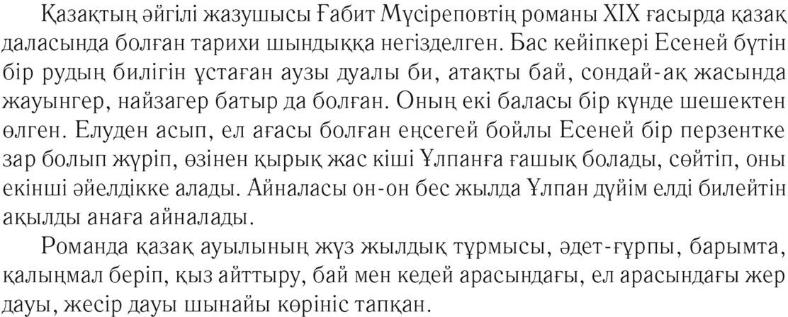 💳 Оплатить за товар можно при получении 🇰🇿 Есть бесплатная доставка по Казахстану 🎁 Копите бонусы с каждой покупки Серия: Мектеп кітапханасы Қазақтың әйгілі жазушысы Ғабит Мүсіреповтің романы ХІХ ғасырда қазақ даласында болған тарихи шындыққа негізделген. Бас кейіпкері Есеней бүтін бір рудың билігін ұстаған аузы дуалы би, атақты бай, сондай-ақ жасында жауынгер, найзагер батыр да болған. Оның екі баласы бір күнде шешектен өлген. Елуден асып, ел ағасы болған еңсегей бойлы Есеней бір перзентке зар болып жүріп, өзінен қырық жас кіші Ұлпанға ғашық болады, сөйтіп, оны екінші әйелдікке алады. Айналасы он-он бес жылда Ұлпан дүйім елді билейтін ақылды анаға айналады. Романда қазақ ауылының жүз жылдық тұрмысы, әдет-ғұрпы, барымта, қалыңмал беріп, қыз айттыру, бай мен кедей арасындағы, ел арасындағы жер дауы, жесір дауы шынайы көрініс тапқан. |