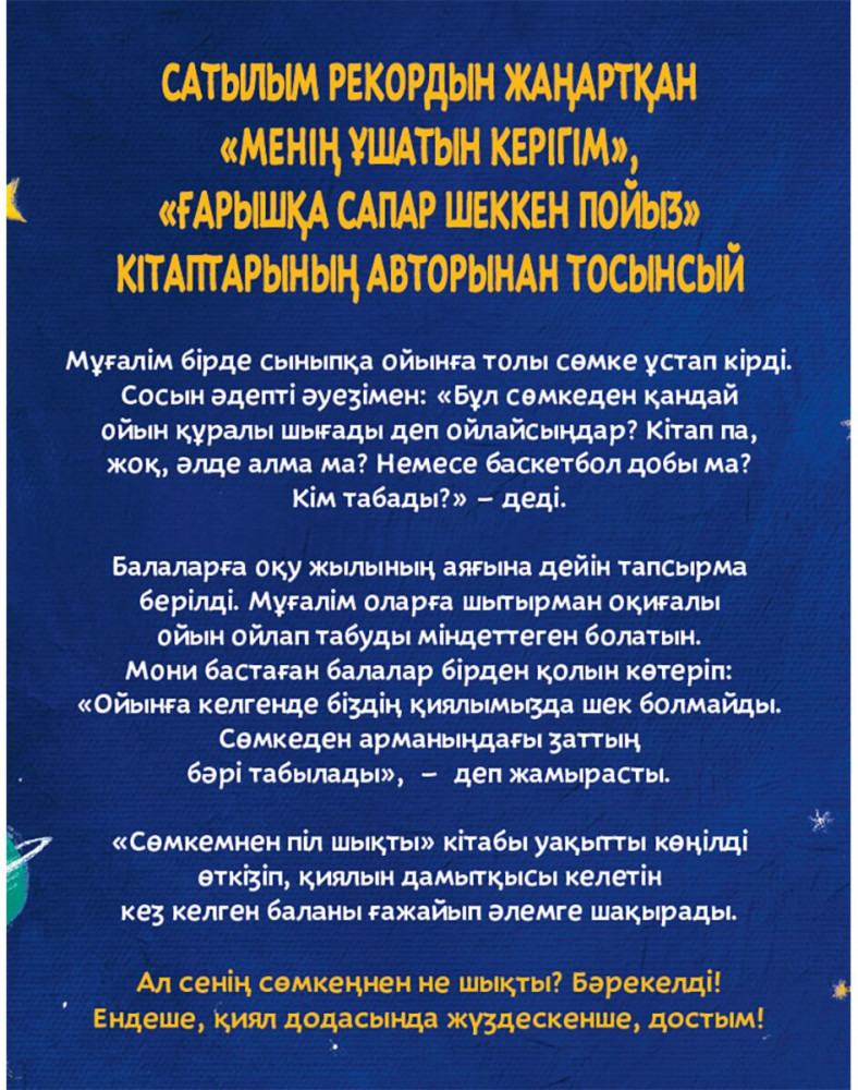 Сөмкемнен піл шықтыВ данный момент этот товар отсутствует в продаже. Возможно, у нас найдется аналогичный или похожий товар здесь. Серия: Балаларға базарлық Мұғалім оқушыларға шытырман оқиғаға толы ойын түрлерін ойлап табуға тапсырма береді. Ойынды бастау үшін жай ғана «Сөмкемнен піл шықты» десе жеткілікті. Балалар армандаған затының бәрі табыла кететін көк сөмкені өздеріне серік етеді... Енді олар сан алуан ойын түрлерін ойлап тауып, уақытын көңілді өткізе алады. «Сөмкемнен піл шықты» кітабы қиялын дамытқысы келетін кез келген баланы ғажайыпқа сендіріп, өз әлеміне саяхаттауға шақырады. Ендеше, балақайлармен қиял көгіне сапар шегіп, құпияға толы сөмкенің сырын бірге ашайық. |