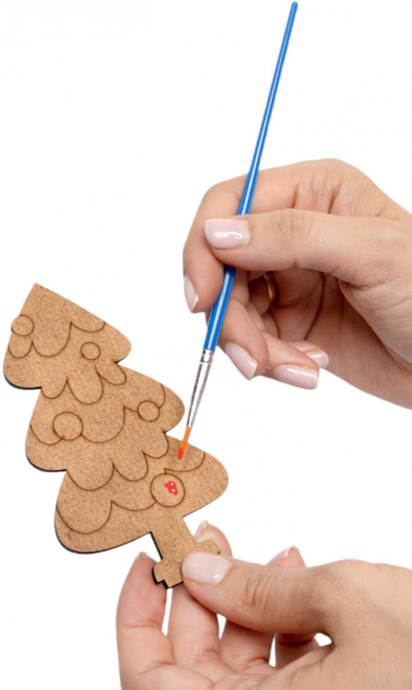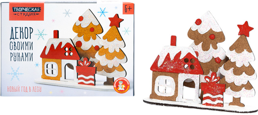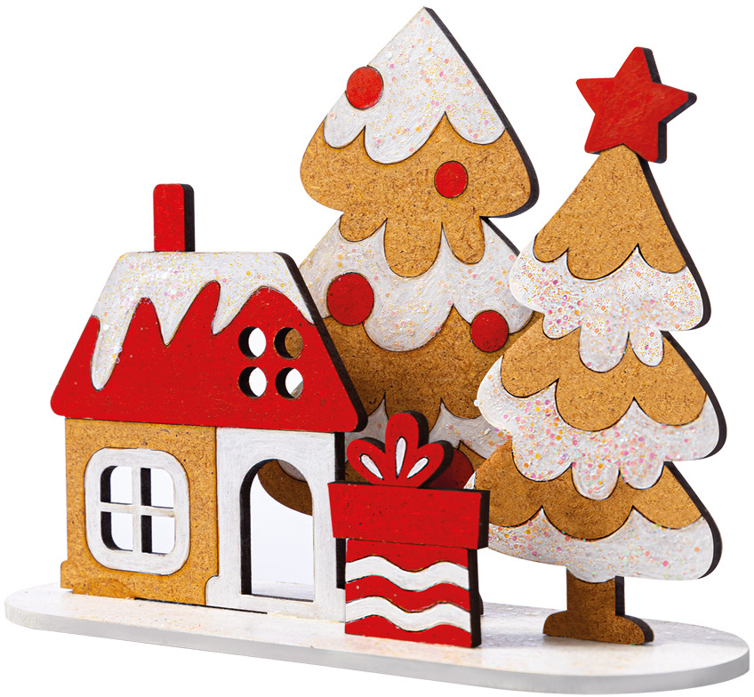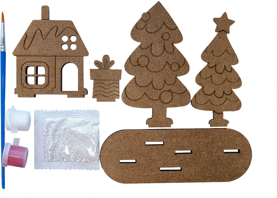 • детали из древесного материала (дом, 2 ёлки, подарок, подставка) — 5 шт.;