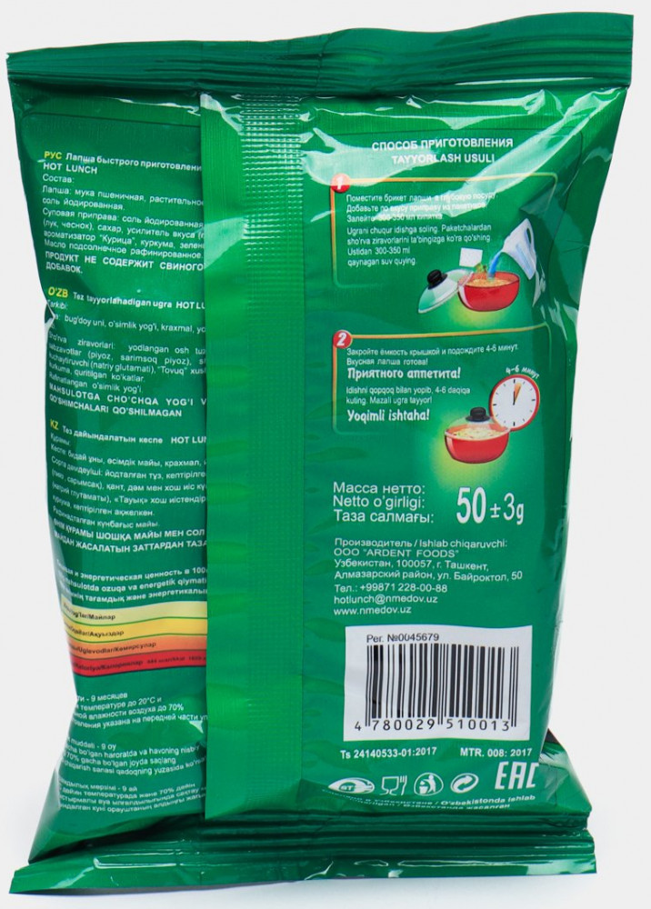 Аппетитная лапша быстрого приготовления по японской технологии. Бренд Hot Lunch принадлежит крупной производственной компании N’medov, расположенной в Узбекистане. |