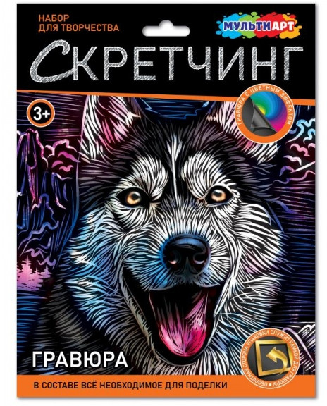 Набор для творчества — скретчинг гравюра «Хаски» ТМ «Мульти Арт» — отличный подарок для ребёнка, который будет способствовать развитию его творческих способностей.