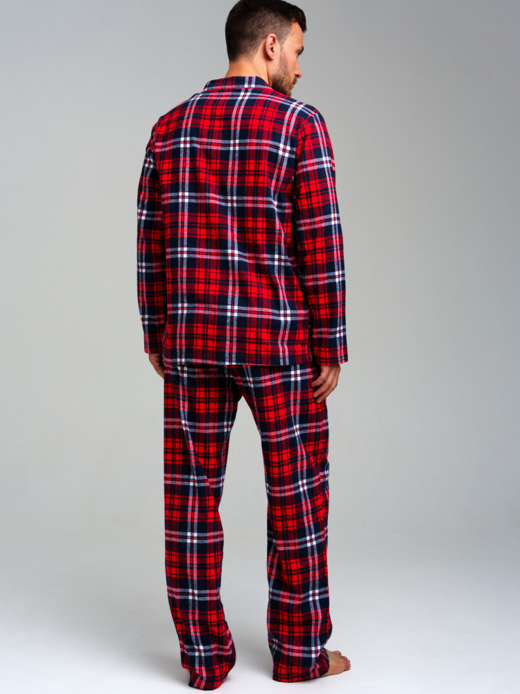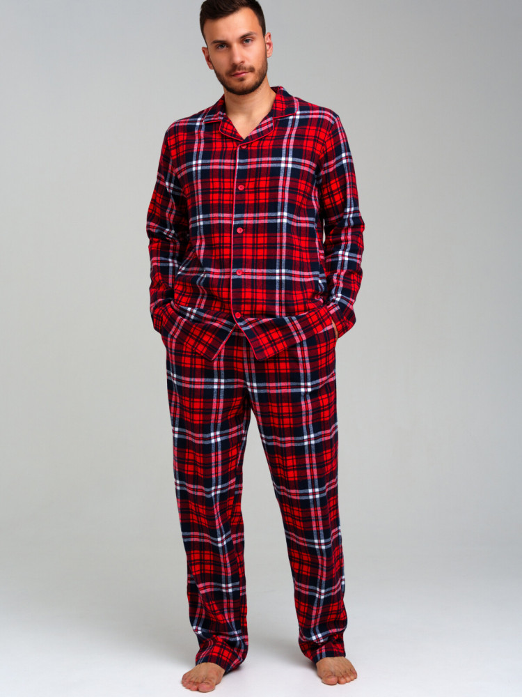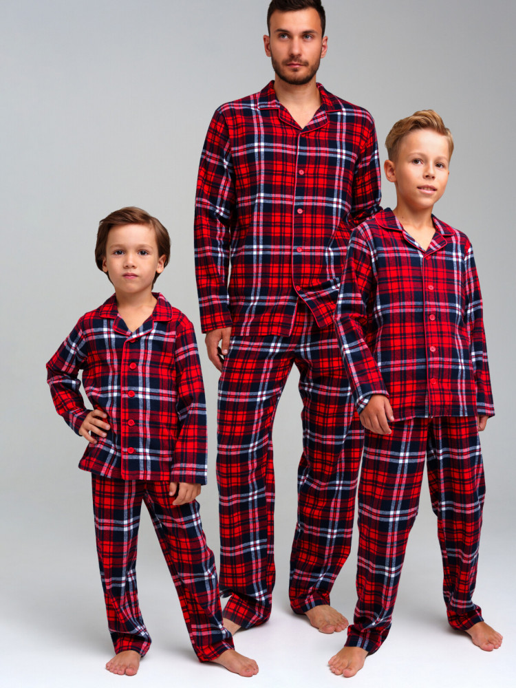 Мужская фланелевая пижама. 100% хлопок. Фланель — мягкая, приятная к телу ткань с небольшим начесом. Застежка на пуговицы. Карманы в брюках. Эластичный пояс с тесьмой позволяет легко надевать брюки и утягивать до комфортной посадки. Можно составить family look c детским вариантом пижамы аналогичного дизайна.