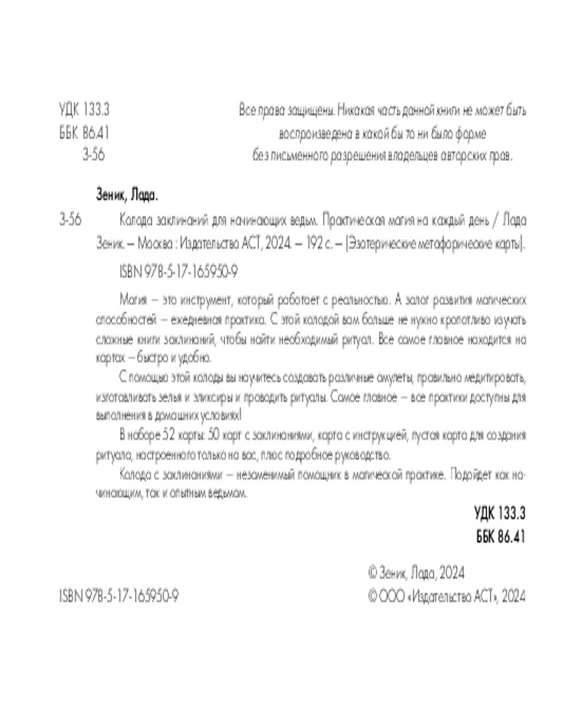 💳 Оплатить за товар можно при получении 🇰🇿 Есть бесплатная доставка по Казахстану от 1 дня 🎁 Копите бонусы с каждой покупки Серия: Эзотерические метафорические карты (коробка с картами + руководство) Некоторые люди полагают, что магия — это недоступное знание, в существовании которого можно сомневаться. На самом деле она — инструмент, который работает с реальностью. Колода в ваших руках — доказательство, что магия существует. Теперь вам не нужно кропотливо изучать сложные книги заклинаний, чтобы найти подходящий к ситуации ритуал. Все самое необходимое находится на картах — быстро, подробно и удобно. Залог развития магических способностей — ежедневная практика. На каждой карте вы найдете ритуал, медитацию, рецепт приготовления эликсира или заклинания, для которых не потребуется особых усилий. Всё можно сделать, используя подручные средства и ингредиенты. Магическая колода с заклинаниями — это незаменимый помощник, который подойдет как начинающим ведьмам, так и опытным колдуньям. |