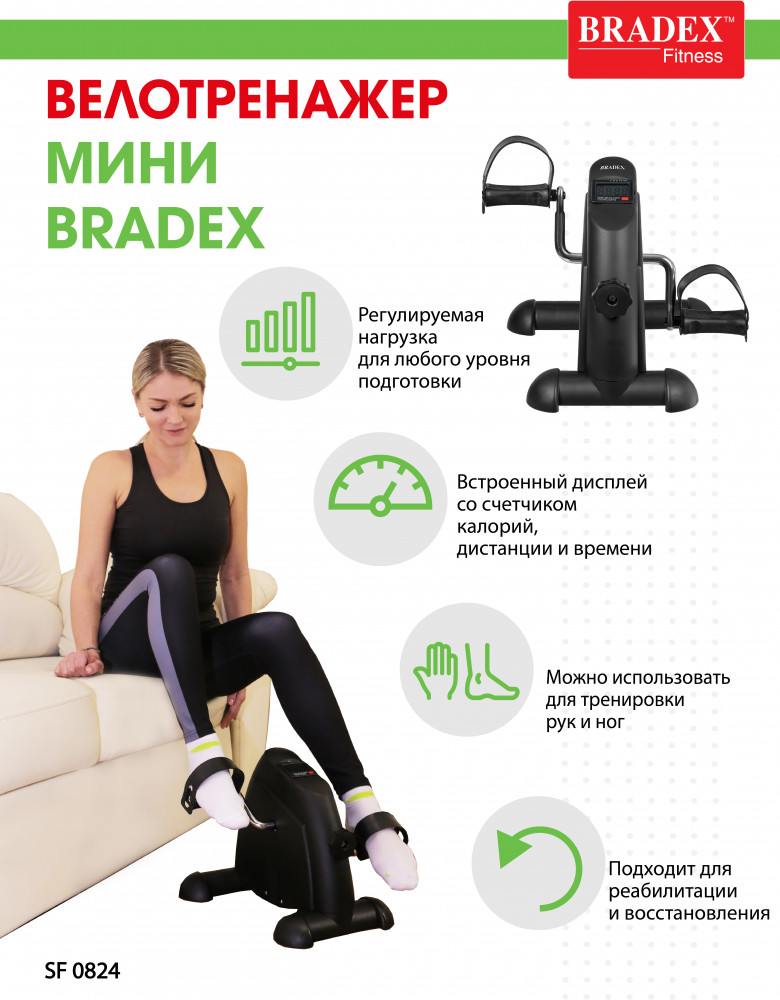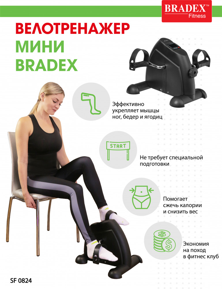 Компактный мини-велотренажер Bradex SF 0824 укрепляет мышцы ног, бедер, ягодиц, спины, рук и плеч, сжигая калории и снижая вес. Благодаря постоянным тренировкам улучшается кровообращение и работа сердца. Велотренажер предназначен только для домашнего использования. Дизайн тренажера выполнен в черном цвете, отличается лаконичностью форм и гармонично впишется практически в любой интерьер.