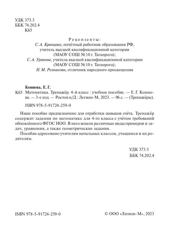 💳 Оплатить за товар можно при получении 🇰🇿 Есть бесплатная доставка по Казахстану от 1 дня 🎁 Копите бонусы с каждой покупки Серия: Начальное общее образование Наше пособие предназначено для отработки навыков счёта. Тренажёр содержит задания по математике для 4-го класса с учётом требований обновлённого ФГОС НОО. В него вошли различные виды примеров и задач, уравнения, а также геометрические задания. Пособие адресовано учителям начальных классов, учащимся и их родителям. |
