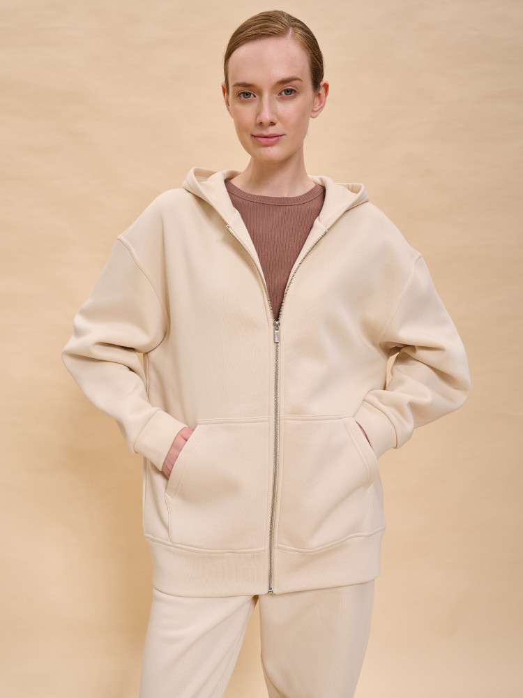 Худи зипка женская. Супертрендовая трикотажная куртка оверсайз из футера с начёсом — отличная альтернатива ветровке в прохладную погоду. Толстовка женская с капюшоном застёгивается на центральную металлическую молнию. В составе ткани преобладает хлопок — зипка мягкая, приятная на ощупь и хорошо пропускает воздух. Полиэстер обеспечивает изделию прочность и долговечность. Капюшон с подкладкой — хорошо держит форму. Манжеты по низу и на рукавах из основной ткани. По переду толстовка женская оверсайз дополнена объёмным накладным карманом-кенгуру. Зипка — базовый элемент для стильного повседневного гардероба. Легко сочетается с джинсами, спортивными брюками и брюками карго. Толстовка с капюшоном лаконичного дизайна, без принтов. Куртка выполнена в универсальных оттенках, которые легко сочетаются с одеждой разных цветов. Стильное и практичное худи женское на молнии неприхотливо в уходе.
