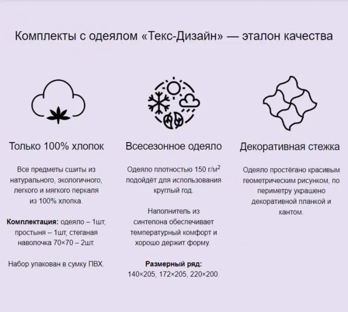 Одеяло простёгано красивым геометрическим рисунком, по периметру украшено декоративной планкой и кантом. Наволочка двухсторонняя на молнии, верх наволочки простеган также геометрическим рисунком. Долговечность. Износостойкий набор постельного белья с одеялом выдерживает до 200 стирок, дает минимальную усадку при стирке, не подвержен образованию катышков, прост в уходе — подтверждено отзывами покупателей после стирки. Использование активных красителей обеспечивает долгий срок службы без потери качества рисунка, а сертификат безопасности подтверждает экологичность и гипоаллергенность ивановского постельного белья от «Текс-Дизайна». Хороших снов и приятных покупок!