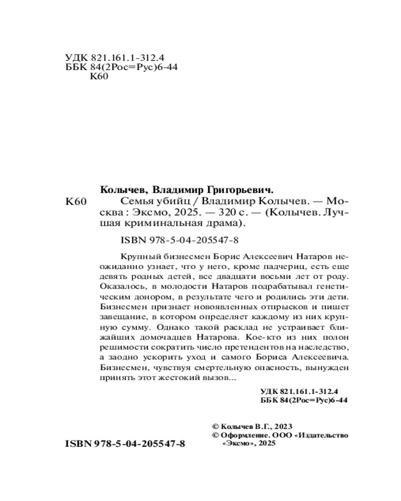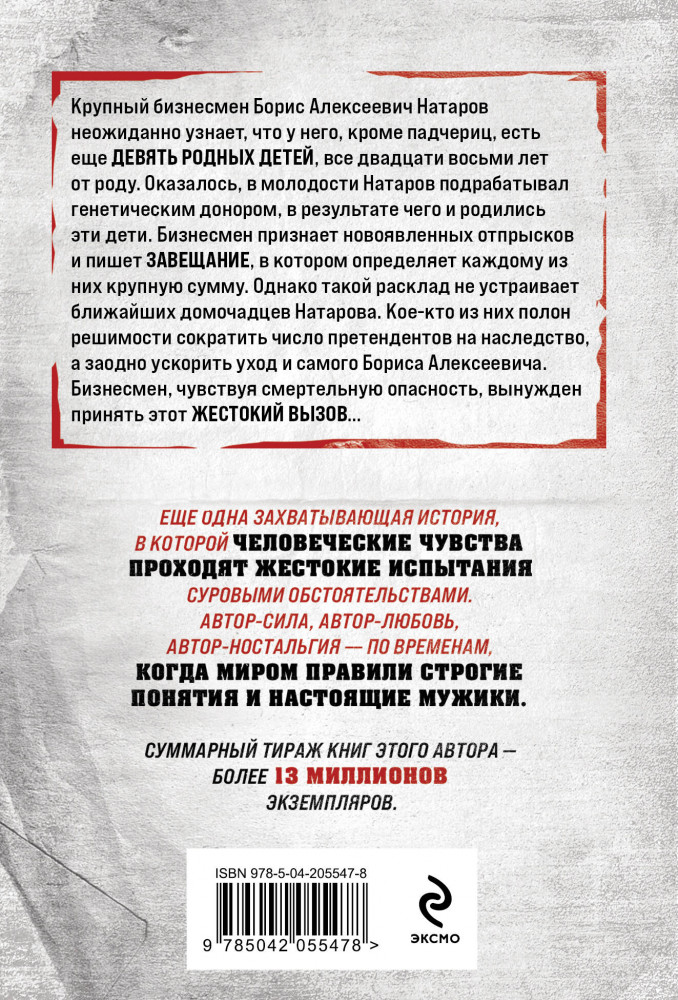 💳 Оплатить за товар можно при получении 🇰🇿 Есть бесплатная доставка по Казахстану от 1 дня 🎁 Копите бонусы с каждой покупки Серия: Колычев. Лучшая криминальная драма (обложка) Крупный бизнесмен Борис Алексеевич Натаров неожиданно узнает, что у него, кроме падчериц, есть еще девять родных детей, все двадцати восьми лет от роду. Оказалось, в молодости Натаров подрабатывал генетическим донором, в результате чего и родились эти дети. Бизнесмен признает новоявленных отпрысков и пишет завещание, в котором определяет каждому из них крупную сумму. Однако такой расклад не устраивает ближайших домочадцев Натарова. Кое-кто из них полон решимости сократить число претендентов на наследство, а заодно ускорить уход и самого Бориса Алексеевича. Бизнесмен, чувствуя смертельную опасность, вынужден принять этот жестокий вызов... |