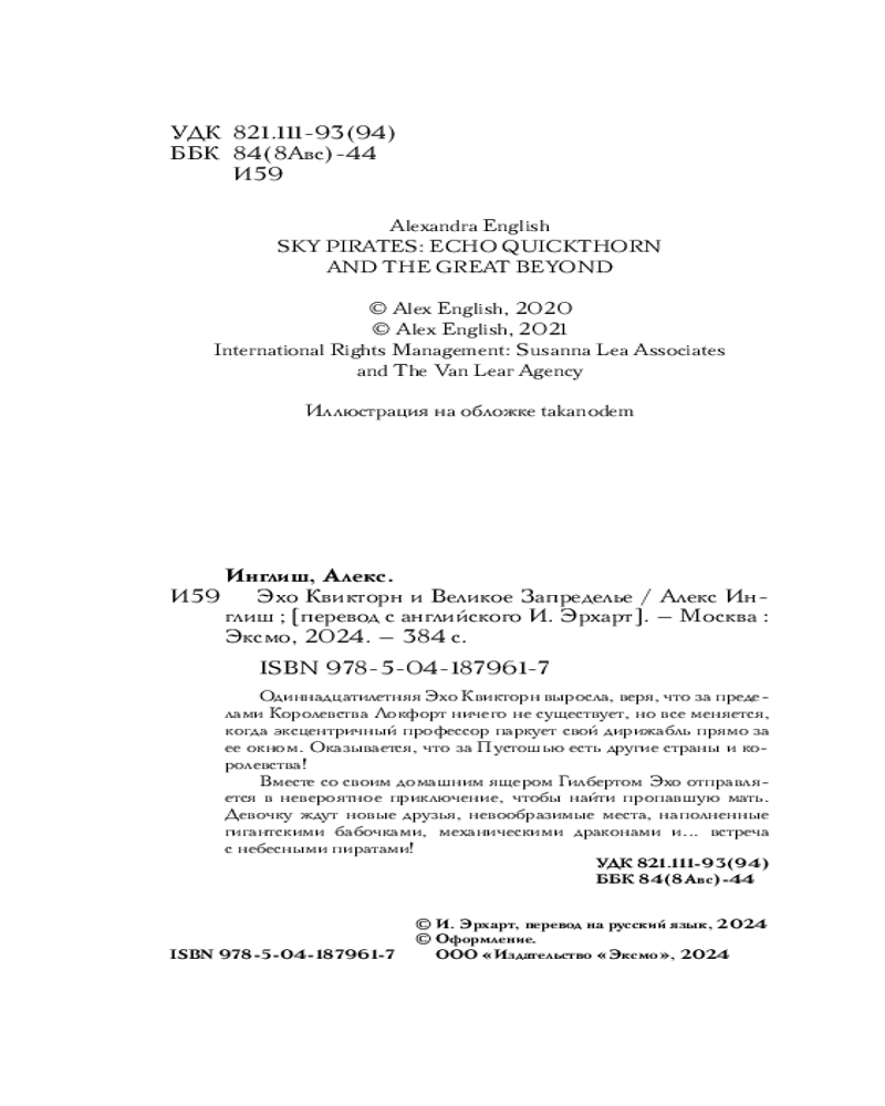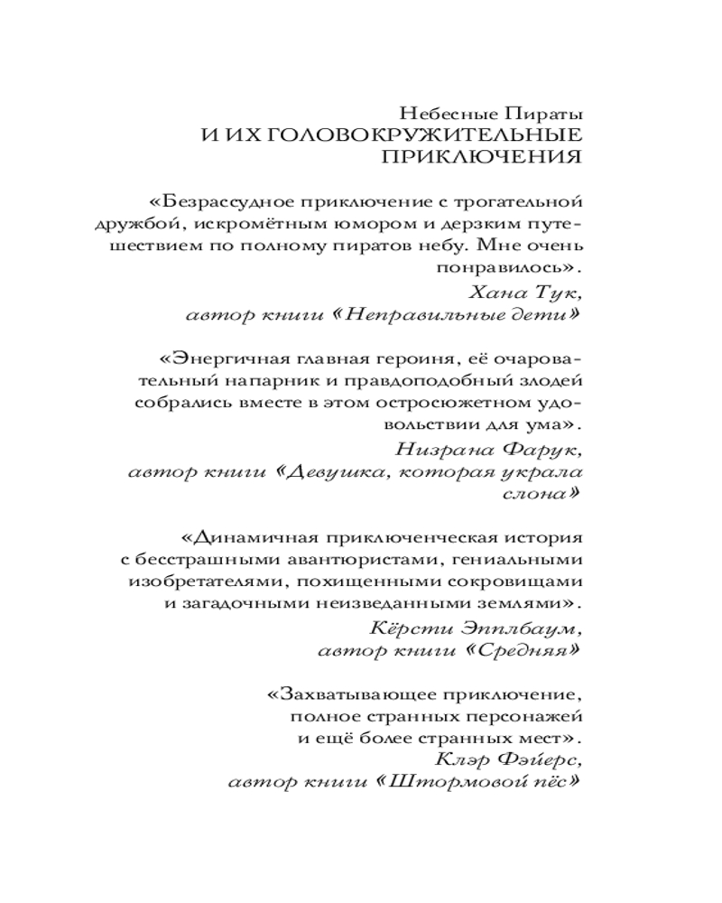💳 Оплатить за товар можно при получении 🇰🇿 Есть бесплатная доставка по Казахстану от 1 дня 🎁 Копите бонусы с каждой покупки Серия: Детск. Небесные пираты Приготовьтесь к захватывающему приключению в необыкновенном мире! Вас ждут огромные дирижабли, механические драконы и небесные пираты! Одиннадцатилетняя Эхо Квикторн выросла, веря, что за пределами Королевства Локфорт ничего не существует, но все меняется, когда эксцентричный профессор паркует свой дирижабль прямо за ее окном. Оказывается, что за Пустошью есть другие страны и королевства! Вместе со своим домашним ящером Гилбертом Эхо отправляется в невероятное приключение, чтобы найти пропавшую мать. Девочку ждут новые друзья, невообразимые места, наполненные гигантскими бабочками, механическими драконами, и... встреча с небесными пиратами! |