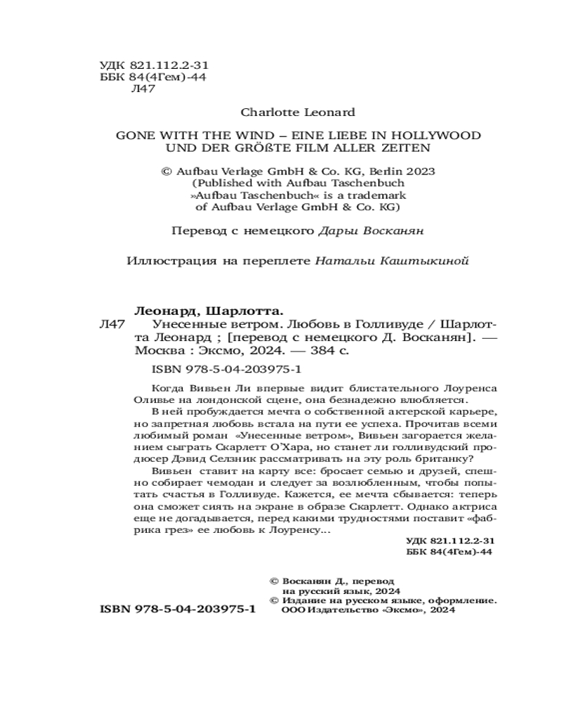 💳 Оплатить за товар можно при получении 🇰🇿 Есть бесплатная доставка по Казахстану от 1 дня 🎁 Копите бонусы с каждой покупки Серия: Novel. Страсть и искусство История о съемках оскароносного фильма «Унесенные ветром» и запретной любви на фабрике грез. Когда Вивьен Ли впервые видит блистательного Лоуренса Оливье на лондонской сцене, она безнадежно влюбляется. В ней пробуждается мечта о собственной актерской карьере, но тайная страсть встала на пути ее успеха. Прочитав всеми любимый роман «Унесенные ветром», Вивьен загорается желанием сыграть Скарлетт О’Хара, но станет ли голливудский продюсер Дэвид Селзник рассматривать на эту роль британку? |