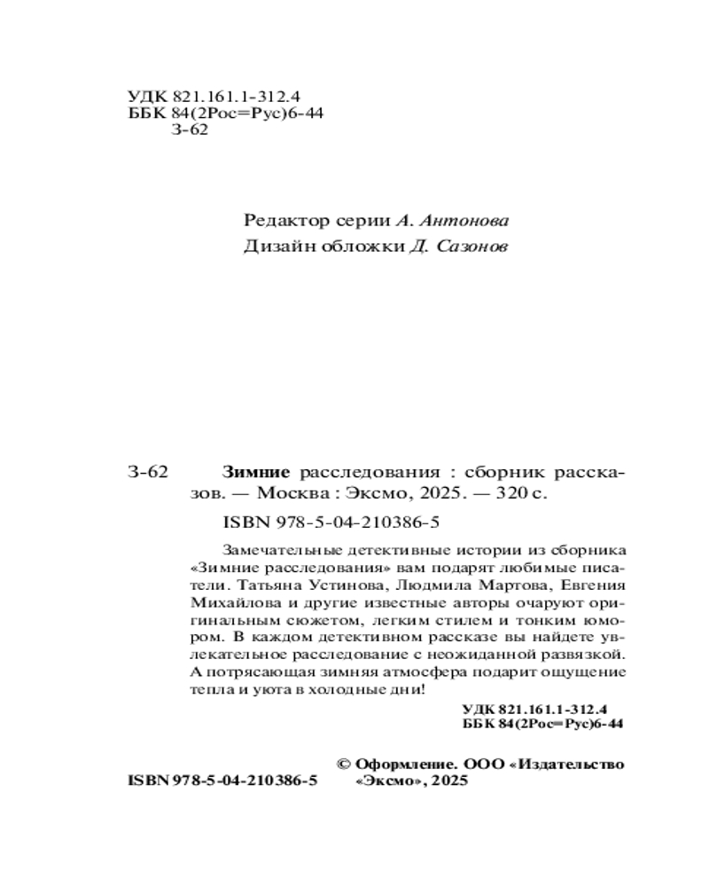 💳 Оплатить за товар можно при получении 🇰🇿 Есть бесплатная доставка по Казахстану от 1 дня 🎁 Копите бонусы с каждой покупки Серия: Великолепные детективные истории. Новое оформление (обложка) Замечательные детективные истории из сборника «Зимние расследования» вам подарят любимые писатели. Татьяна Устинова, Людмила Мартова, Евгения Михайлова, Альбина Нури и другие известные авторы очаруют оригинальным сюжетом, легким стилем и тонким юмором. В каждом детективном рассказе вы найдете увлекательное расследование с неожиданной развязкой. А потрясающая зимняя атмосфера подарит ощущение тепла и уюта в холодные дни! |