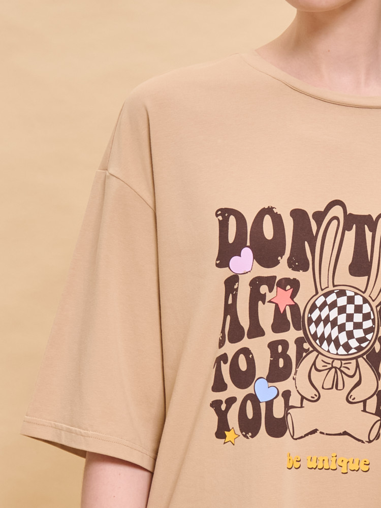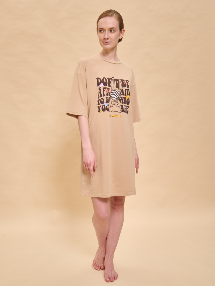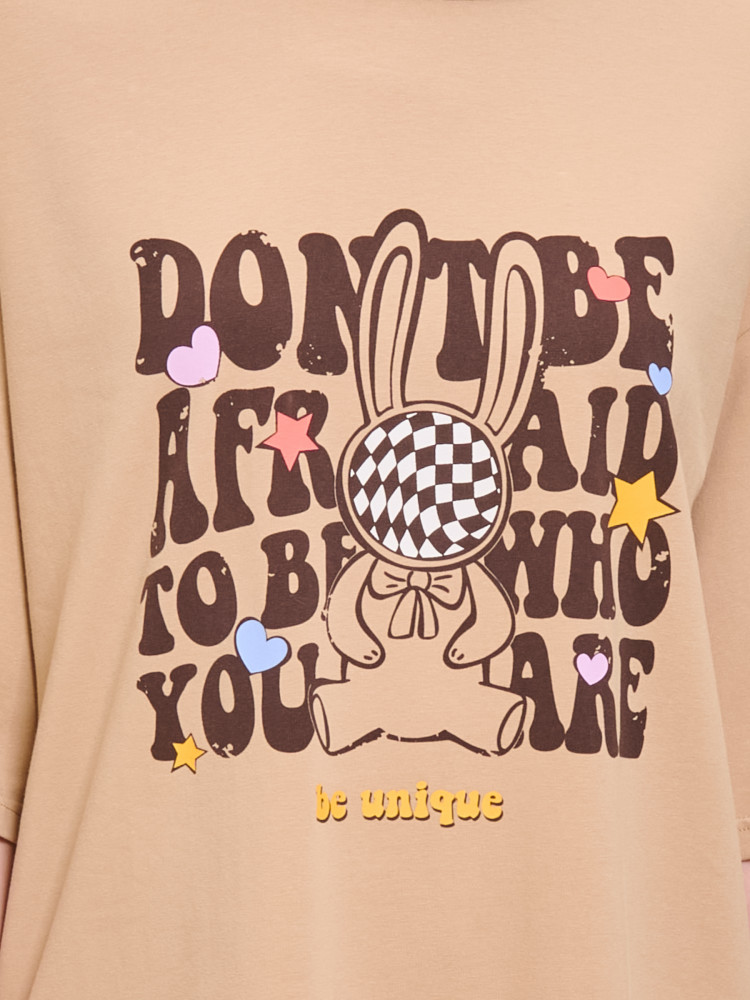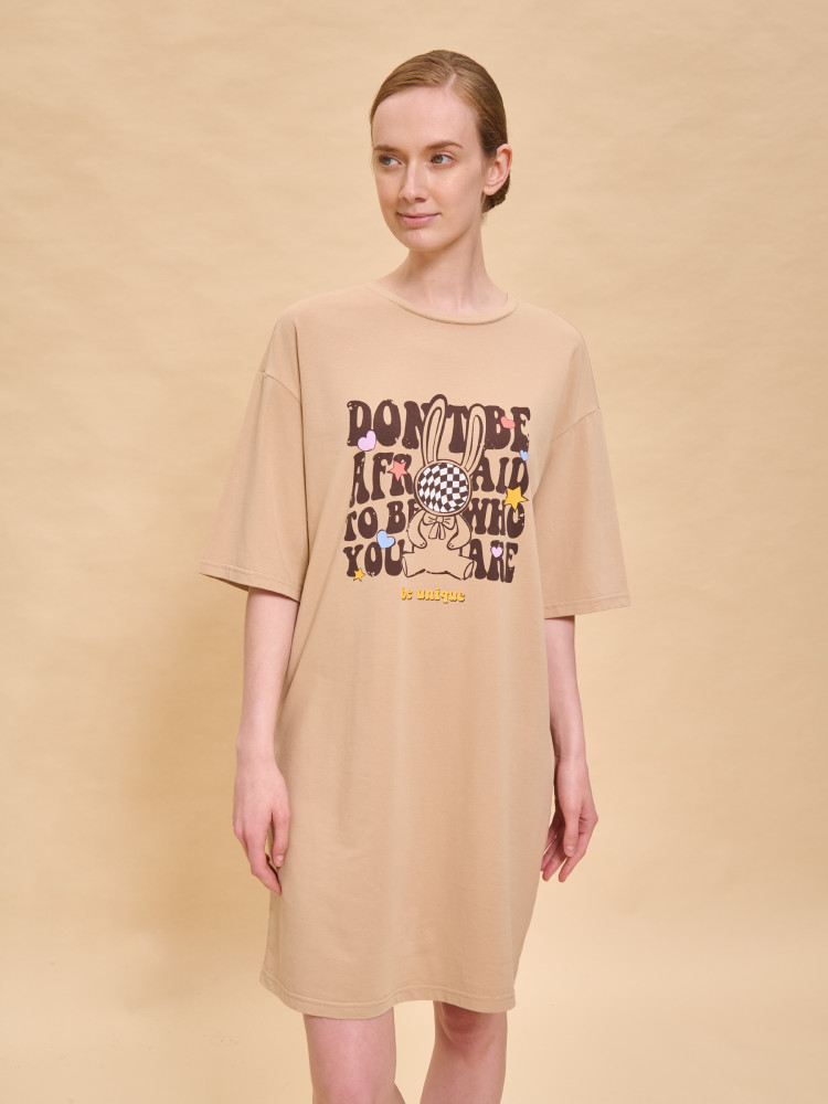 Платье футболка женское оверсайз. Трикотажное платье оверсайз прямого кроя с коротким широким рукавом. Плечо спущено — модель максимально комфортная. Однотонное платье-футболка с принтом — базовый элемент женского гардероба. Повседневное платье свободного кроя подойдет для любой фигуры. В составе ткани изделия преобладает высококачественный хлопок — платье мягкое и отлично пропускает воздух, позволяя коже дышать. Эластан помогает модели надолго сохранить первоначальную форму. Модель украшает позитивный принт в виде забавного зайчика, надписи переводятся: «не бойся быть тем, кто ты есть», «ты уникален». Принт эластичный и прочный, отлично переносит многочисленные стирки. Просторное платье в спортивном стиле подходит как женщинам, так и девушкам, девочкам-подросткам. Свободное платье оверсайз идеально для носки дома, комфортного сна, пижамной вечеринки, отдыха. Платье майка подходит для повседневного летнего гардероба, прогулок, отдыха, пляжа. А также модель удобна для беременных.