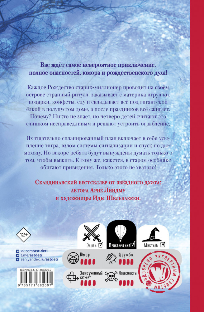 Операция «Рождество», или Невероятное ограблениеВ данный момент этот товар отсутствует в продаже. Возможно, у нас найдется аналогичный или похожий товар здесь. Серия: Новогодний бестселлер Каждое Рождество старик-миллионер проводит на своём острове странный ритуал: заказывает с материка игрушки, подарки, конфеты, еду и складывает всё под гигантской ёлкой в полупустом доме, а после праздников всё сжигает. Почему? Никто не знает, но четверо детей считают это слишком несправедливым и решают устроить ограбление. Их тщательно спланированный план включает в себя усыпление тигра, взлом системы сигнализации и спуск по дымоходу. Но вскоре ребята будут вынуждены думать только о том, чтобы выжить. К тому же, кажется, в старом особняке обитают привидения. Только этого не хватало! Вас ждёт самое невероятное приключение, полное опасностей, юмора и рождественского духа! Норвежский бестселлер от звёздного дуэта Арне Линдму и Иды Шельбаккен. |