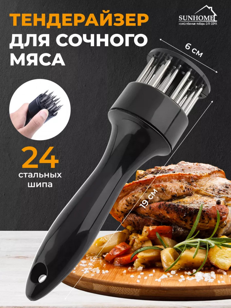 Тендерайзер кухонный помощник для размягчения мясных стейков. Он не работает как молоток для отбивания, тендерайзер-размягчитель прокалывает стейк сразу в нескольких местах, что позволяет сохранить форму куска и сделать его сочным и мягким после жарки. Размягчитель с лезвиями делает кусок мягче и сочнее, поэтому он прожаривается быстрее и равномернее, а вкус получается богаче и насыщенней. Достаточно нескольких нажатий стейкером, чтобы подготовить к обжариванию даже крупный стейк.