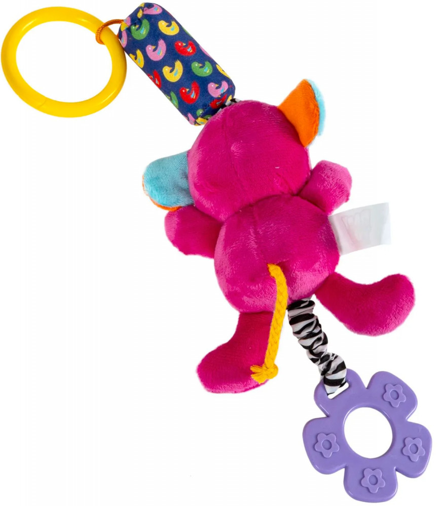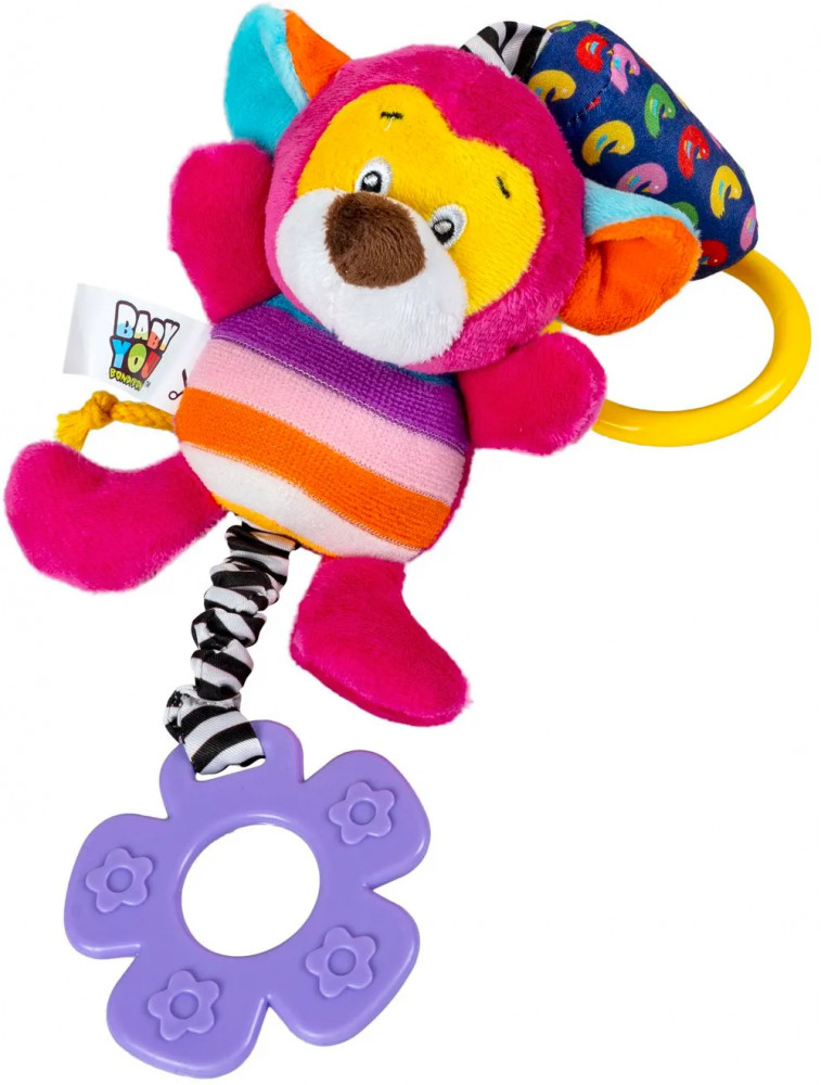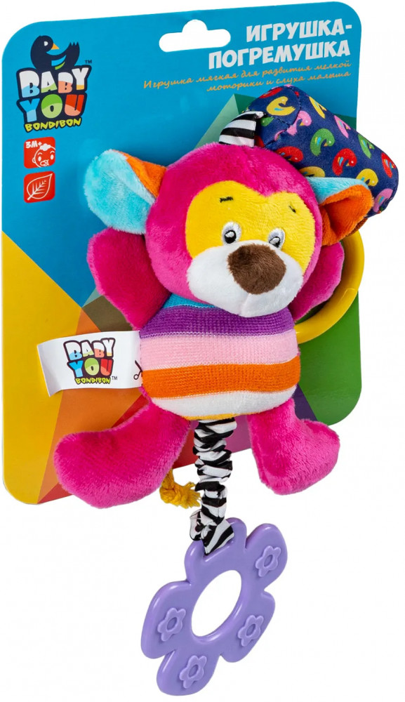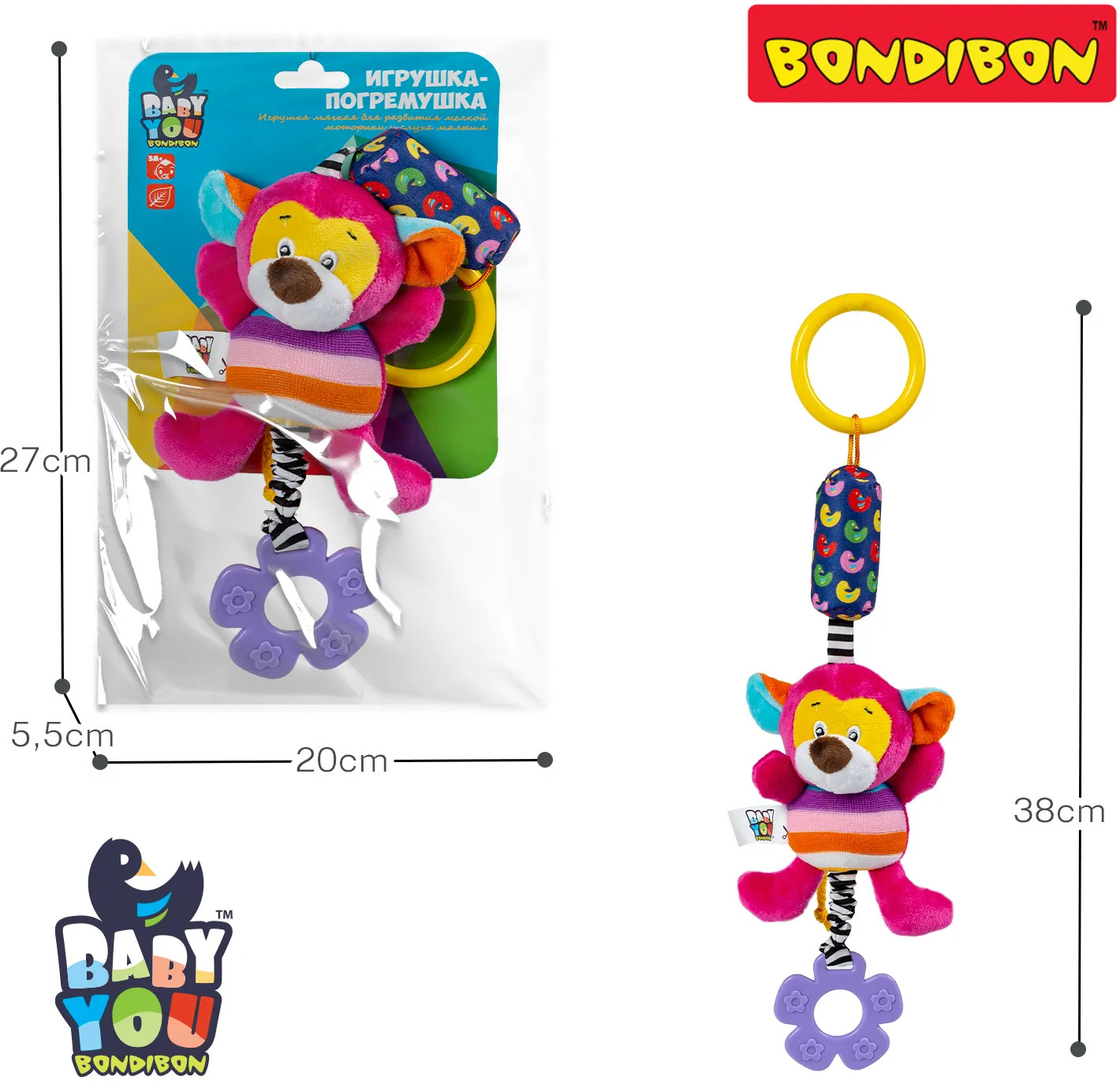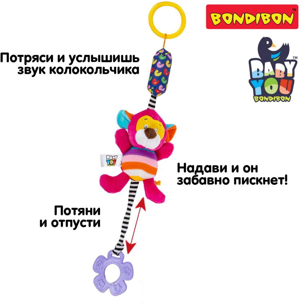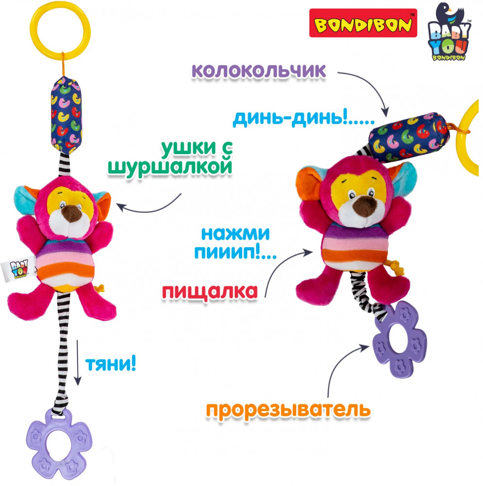 Любая прогулка веселее, если взять с собой друга! Мягкая развивающая игрушка-подвеска Мартышка с колокольчиком серии «Baby You от Bondibon» подарит малышу много идей для игры и станет верным спутником в путешествиях! Прикосновение к ушкам обезьянки подарит малышу приятный шелест, развивая тактильные ощущения и слух, пищалка в теле мартышки добавит эффект неожиданности и веселья в игру. Грызунок для десен в виде цветка на резинке-растяжке поможет малышу справиться с зудом и дискомфортом при прорезывании зубов.
