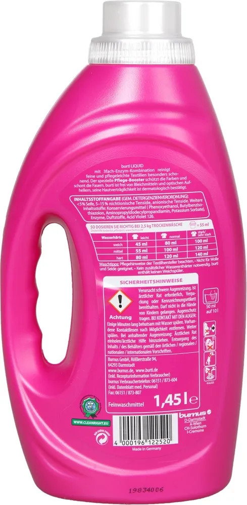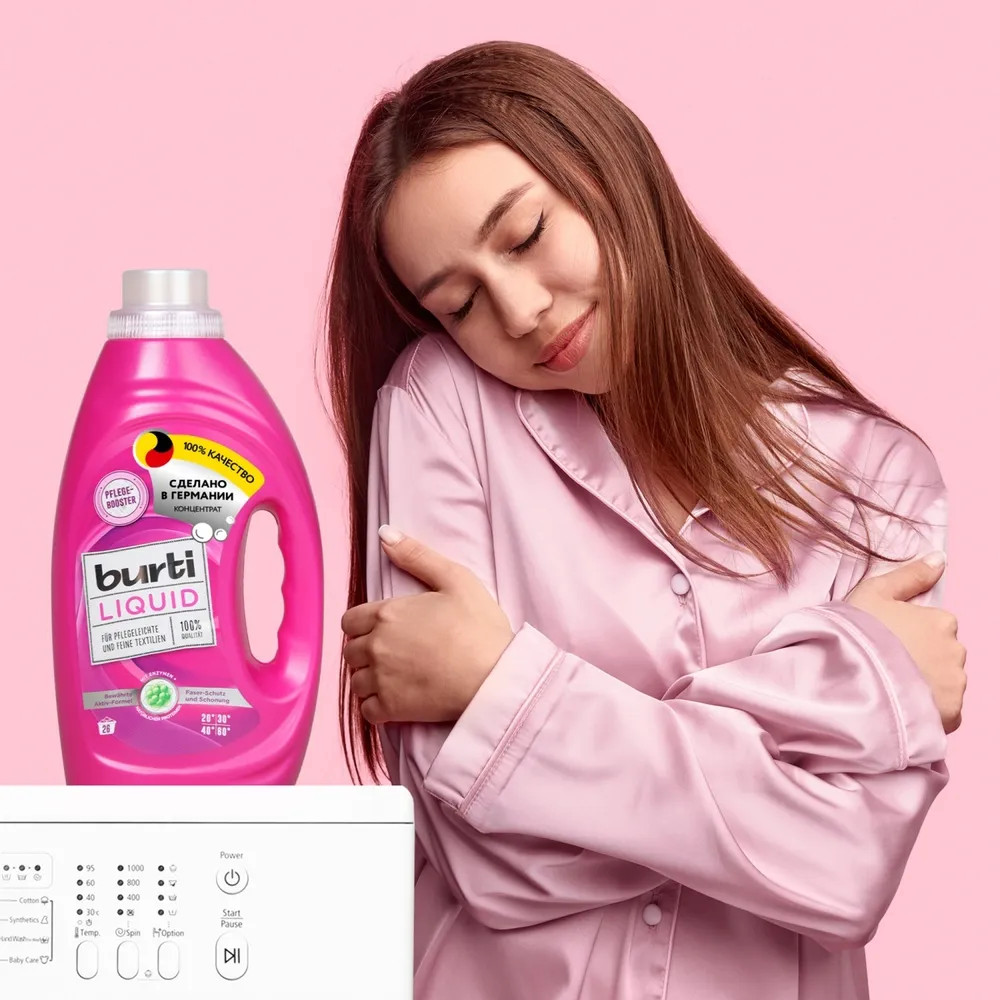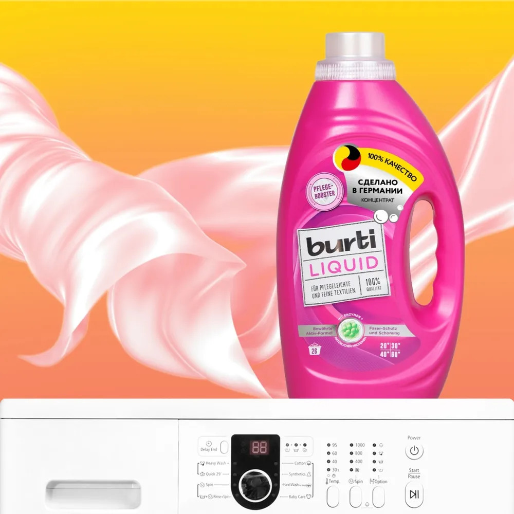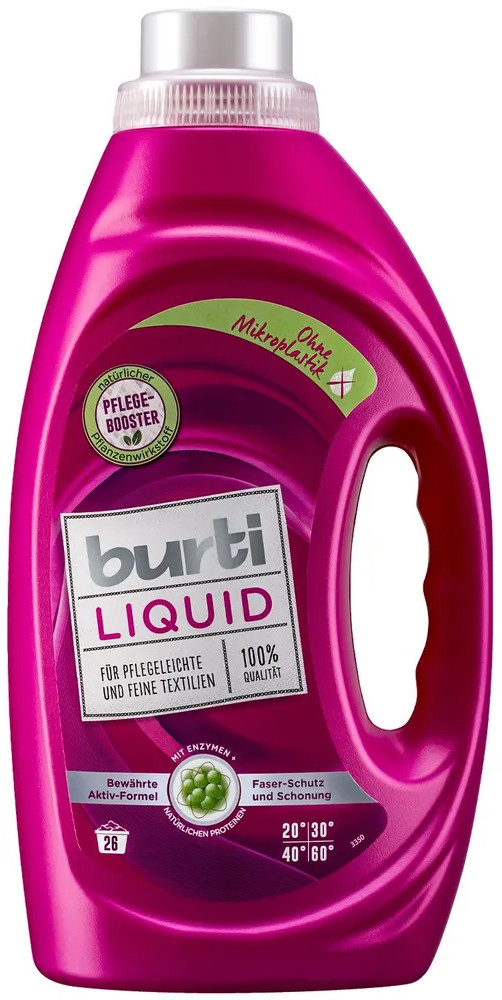 Жидкое средство для стирки цветного и тонкого белья «Burti liquid» с тройной комбинацией энзимов бережно отстирывает цветное и деликатное белье. Входящий в состав средства экстракт корня цикория (Pflege-Booster) укрепляет волокна ткани и помогает сохранить форму и цвет ткани при стирке. Не содержит осветилители и оптические отбеливатели. Дерматологически протестирован. Рассчитано на 26 стирок в стиральной машине.