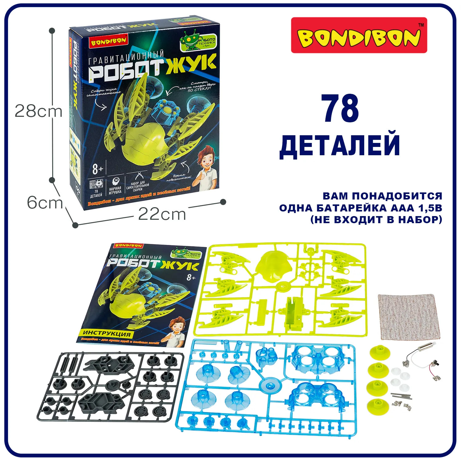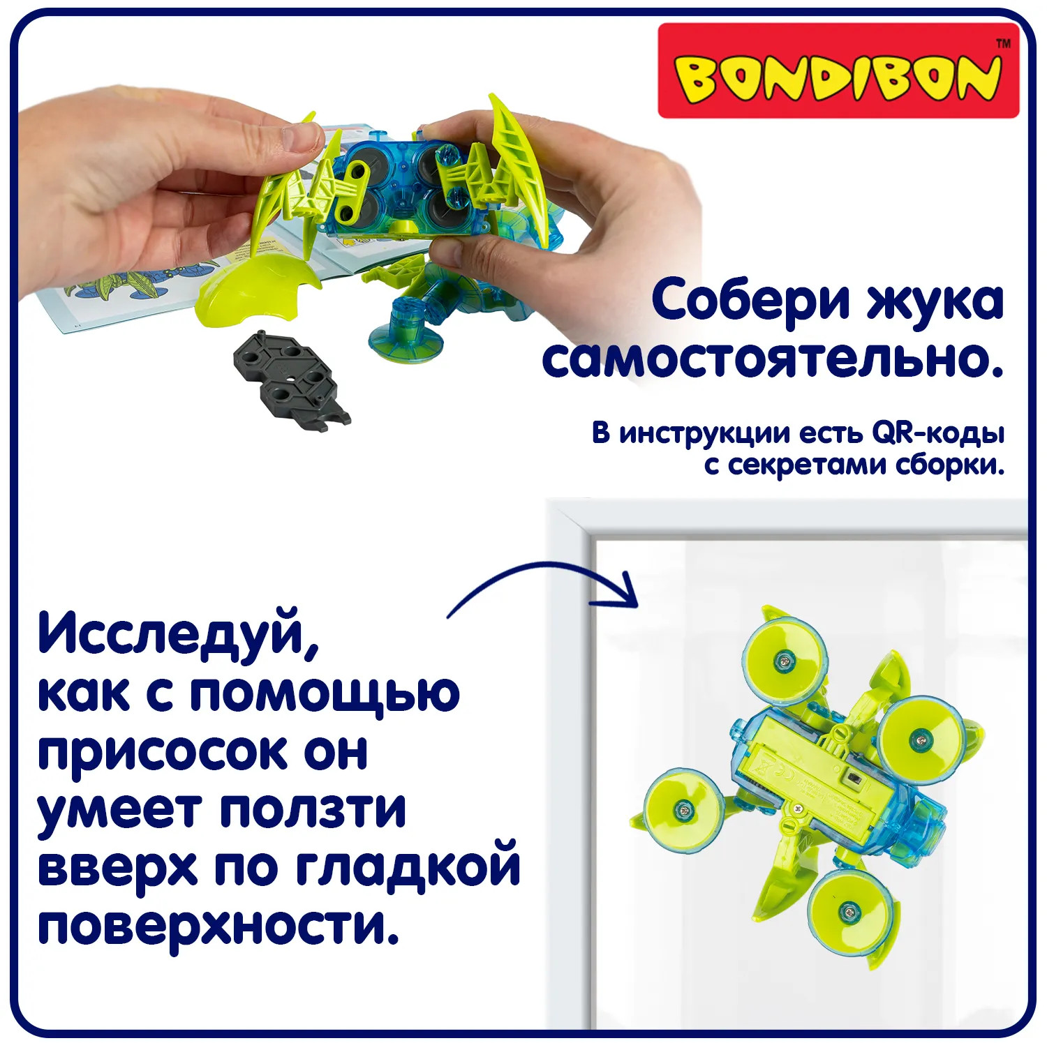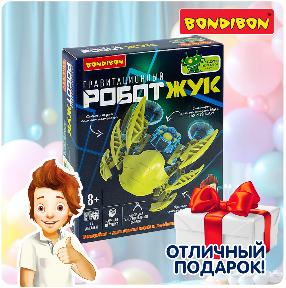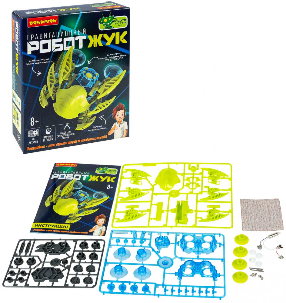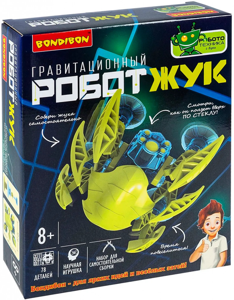 Интересно раскрыть секрет Человека-паука? Сделайте робота-жука, который бросит вызов гравитации и поползет вверх по стеклу. Этот увлекательный набор поможет вашему ребенку не только весело провести время, но и получить полезные знания в области робототехники. Соберите робота, узнайте о механизмах шестеренок, электрической цепи, двигателе и аккумуляторе. Проводите эксперименты с различными поверхностями, играйте с роботом и наблюдайте, как он передвигается по гладким стенам. Умная многоногая машина использует систему присосок для плавной ходьбы по вертикальной гладкой поверхности. Этот набор Робототехники с Буки от Bondibon (Бондибон) станет отличным подарком для юных исследователей и инженеров.
