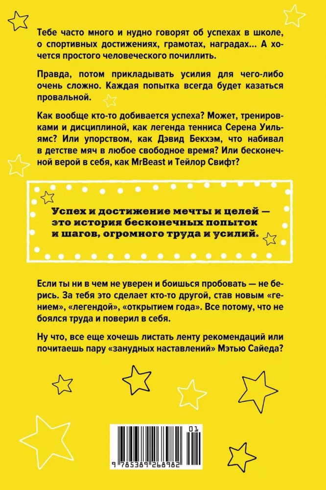 💳 Оплатить за товар можно при получении 🇰🇿 Есть бесплатная доставка по Казахстану от 1 дня 🎁 Копите бонусы с каждой покупки Серия: Популярная психология для бизнеса и жизни Тебе часто много и нудно говорят об успехах в школе, о спортивных достижениях, грамотах, наградах... А хочется простого человеческого почиллить. Правда, потом прикладывать усилия для чего-либо очень сложно. Каждая попытка всегда будет казаться провальной. Как вообще кто-то добивается успеха? Может, тренировками и дисциплиной, как легенда тенниса Серена Уильямс? Или упорством, как Дэвид Бекхэм, что набивал в детстве мяч в любое свободное время? Или бесконечной верой в себя, как MrBeast и Тейлор Свифт? Успех и достижение мечты и целей — это история бесконечных попыток и шагов, огромного труда и усилий. Если ты ни в чем не уверен и боишься пробовать — не берись. За тебя это сделает кто-то другой, став новым «гением», «легендой», «открытием года». Всё потому, что не боялся труда и поверил в себя. |