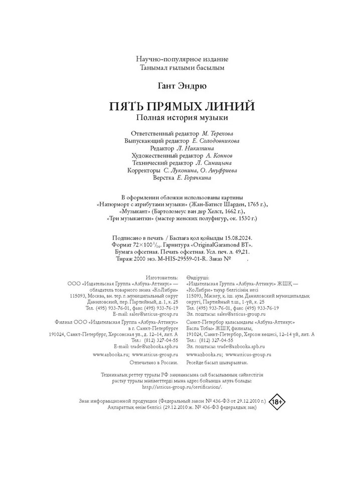 💳 Оплатить за товар можно при получении 🇰🇿 Есть бесплатная доставка по Казахстану от 1 дня 🎁 Копите бонусы с каждой покупки Серия: Исторический интерес Музыка сформировала тот мир, в котором мы живём: от древних певцов, перебирающих струны кифары, до великого Людвига ван Бетховена, от гармонии и ритма до современных мюзиклов. Но что сформировало её саму? Британский композитор и писатель Эндрю Гант рассказывает историю музыки, насчитывающую много веков: с того самого момента, как наши предки впервые научились различать высоту звука и извлекать из орудий шум, который со временем станет музыкой. |