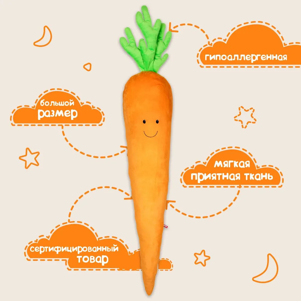 Особенностью этой огромной игрушки подушки является ее многофункциональность. Подушка специально разработана для тех, кто не мыслит своего сна без теплых объятий или просто любит спать на боку, закинув ногу на свернутое одеяло. Именно такая поза считается наиболее физиологичной для сна, поскольку максимально разгружает позвоночник. Благодаря своей длине, данная подушка поможет вам поддерживать правильное положение тела во время засыпания и сна и позволит вам и вашему малышу чувствовать себя комфортно. Игрушка подушка Морковка выручит и маму малыша, который только привыкает спать один и как никогда нуждается в уютном компаньоне. Яркая подушка плюшка прекрасно подойдет на роль обнимашки и игрушки-комфортера, она подарит чувство защищенности, что важно для маленького ребенка (и девочки, и мальчика).