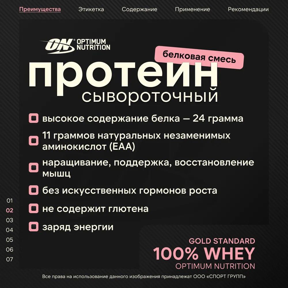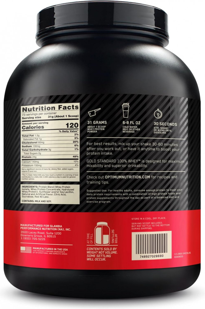 Миллионы покупателей довольны Optimum Nutrition 100% Whey Gold Standard, и они не могут быть неправы! Gold Standard 100% Whey создан для поддержки и восстановления мышц после тренировки, а также широко используется, для дополнительного источника высококачественного белка в ваш основной рацион питания. Начиная с самого начала, Optimum Nutrition установил стандарт, по которому были оценены все другие ингредиенты сывороточного протеина. Теперь мы устанавливаем новый стандарт, с третьим поколением Optimum Nutrition 100% Whey Gold Standard. ON 100% Whey Gold Standard содержит больше изолята сывороточного белка — это самый чистый и самый дорогой источник сывороточного белка. Более высокий процент содержания белка. ON 100% Whey Gold Standard всегда был лидером в этом отношении. Теперь с 24 граммами белка всего лишь в одной порции, это — почти 82%-й белковый концентрат.
