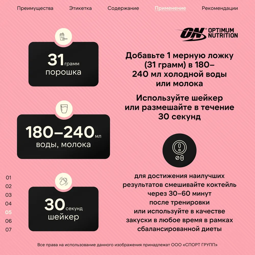 Рекомендации по применению: смешать одну порцию продукта с водой, молоком, соком или другим напитком. Для поддержания положительного азотистого баланса в организме, принимать 2 г протеина на 1 кг веса тела в день. Потреблять протеин небольшими порциями 4-6 раз в день. Например, при весе 80 кг потребуется примерно 160 г протеина в день. Можно принимать 3 порции по 32 г протеина.