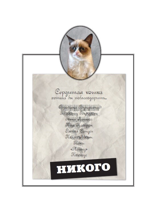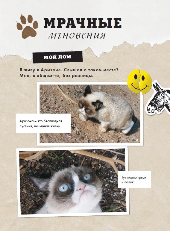 Очень смешно и мрачно читать мнения этой сердитой кошки. Смешные цитаты и интересный просмотр книги раскрашивает день в .... Черные тона))) книга крупная. Советуем! Милана 12 лет.