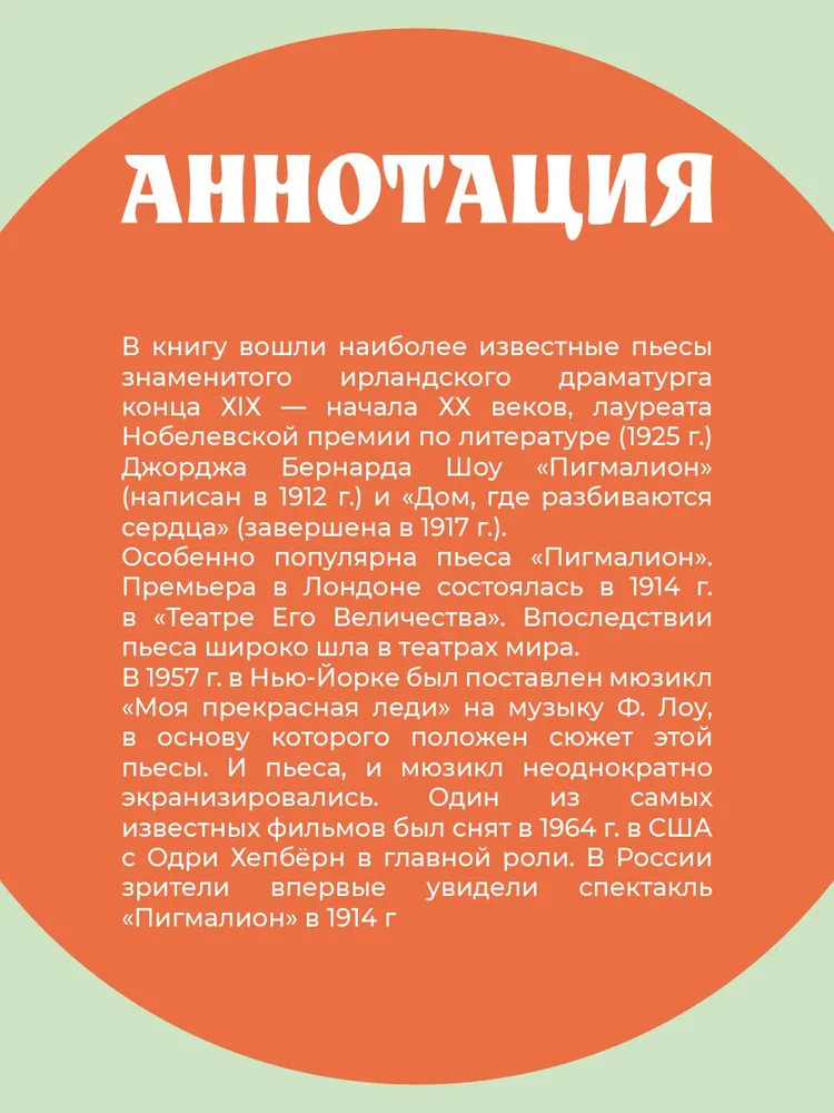 💳 Оплатить за товар можно при получении 🇰🇿 Есть бесплатная доставка по Казахстану от 1 дня 🎁 Копите бонусы с каждой покупки Серия: Живая классика В книгу вошли две культовые пьесы классика британской драматургии Бернарда Шоу. «Пигмалион» (1912) — аллюзия на миф о скульпторе Пигмалионе, который влюбился в собственное творение. Правда, в пьесе Шоу между главной героиней и преобразившим ее профессором не возникает романтической истории. Основная идея пьесы заключается в том, что внешний лоск, хорошие манеры, правильная речь — это всё наносное. Под грубой оболочкой дурно воспитанного, неряшливого и неграмотного человека вполне может скрываться тонкая, умная личность, которая сумеет преобразиться под влиянием хорошего образования. «Дом, где разбиваются сердца» (1917) — тонкая, остроумная сатира на современное автору английское буржуазное общество: тщеславное, лицемерное, безразличное к чувствам других. Вызывающий наибольшую симпатию персонаж пьесы — это няня Гинесс, пытающаяся в этой безалаберной, абсурдной атмосфере создать хоть какое-то подобие уюта и порядка. |