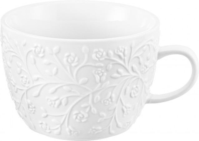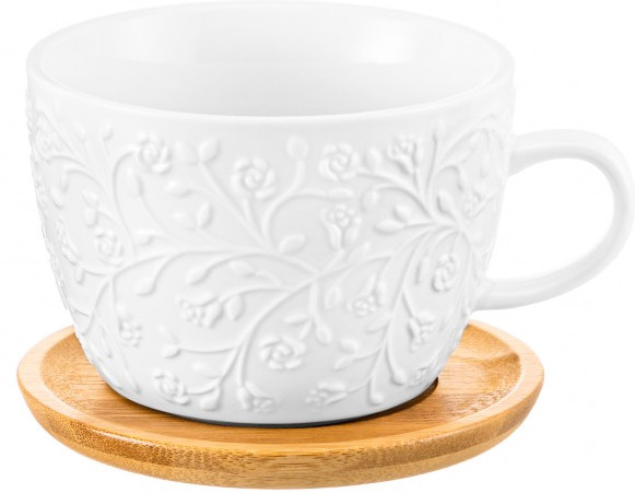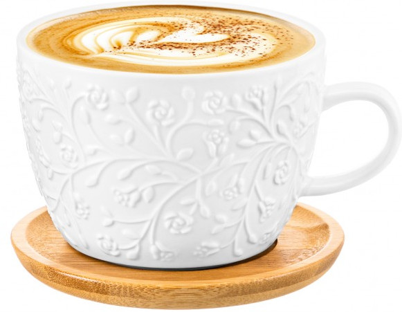 Чашка для капучино и кофе латте выполнена из белого фарфора с рельефным узором. Имеет подставку из бамбука, можно использовать в роли крышки. Большой бокал подходит ценителям кофе, которые любят пить из красивой и необычной посуды. Это идеальный вариант для того, чтобы согреться горячим напитком зимой и освежиться прохладным лимонадом летом. Подойдёт для любых напитков, например, чая. Благодаря большому объёму станет незаменимым предметом на долгом чаепитии или чайной церемонии! Широкая кружечка с бамбуковым блюдцем украсит ваш стол своим стильным дизайном как на праздник, так и в будни. Можно использовать в роли чайной пары.