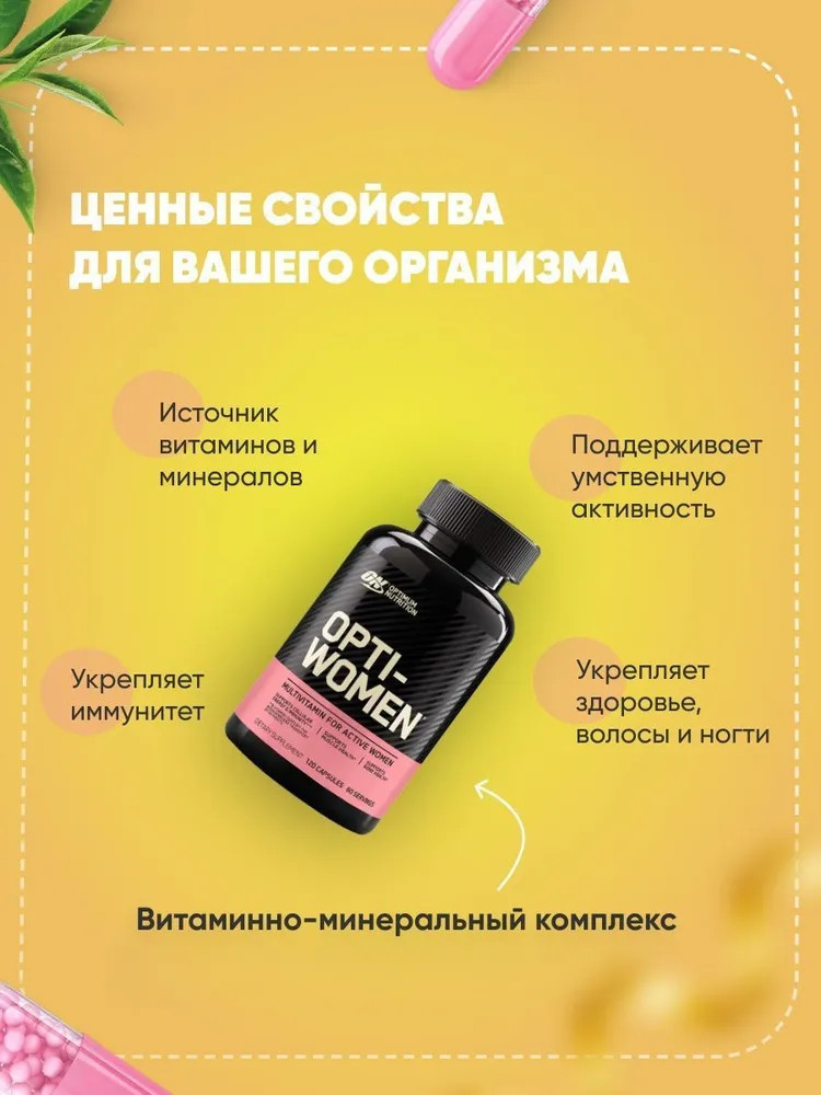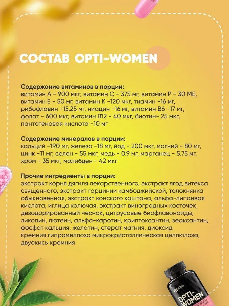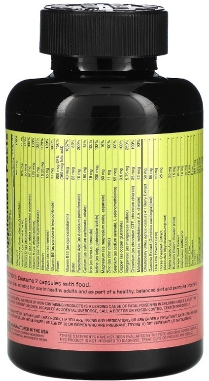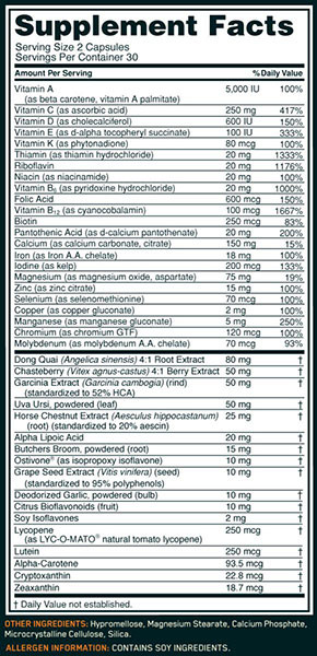 Вит.A-450 мкг, Вит.C-187,5 мг, Вит.D-15 мкг, Вит.E-25 мг, Вит.K-60 мкг, Тиамин-8 мг, Рибофлавин-7,62 мг, Ниацин-8 мг, Вит.B6-8,5 мг, Фолиевая кислота-300 мкг, Вит.B12-20 мкг, Биотин-12,5 мкг, Пантотеновая кислота-5 мг, Кальций-95 мг, Железо-9 мг, Йод-100 мкг, Магний-40 мг, Цинк-5,5 мг, Селен-27,5 мкг, Медь-0,45 мг, Марганец-2,87 мг, Хром-17,5 мкг, Молибден-21 мкг, Витекс 4:1 Ягодный экстракт-25 мг, Экстракт Гарцинии (кожура)-25 мг, Ува Урси порошок (лист)-25 мг, Экстракт конского каштана (корень)-12,5 мг, Альфа-липоевая кислота-10 мг, Иглица колючая, порошок (корень)-7,5 мг, Экстракт виноградных косточек-5 мг, Изопропокси изофлавон-5 мг, Дезодорированный чеснок-5 мг, Лимонная цедра-5 мг, Изофлавоны сои-1 мг, Ликопин-125 мкг, Лютеин-125 мкг, Зеаксантин-9,35 мкг.