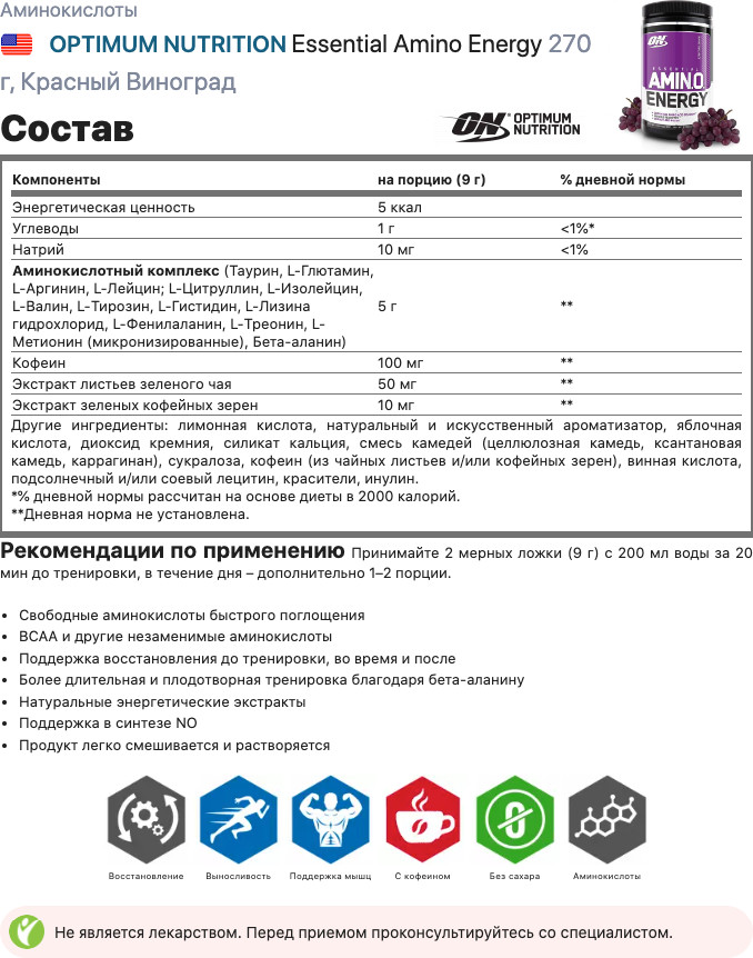 Optimum Nutrition Аминокислоты со вкусом красного винограда «Amino Energy. Concord Grape»
