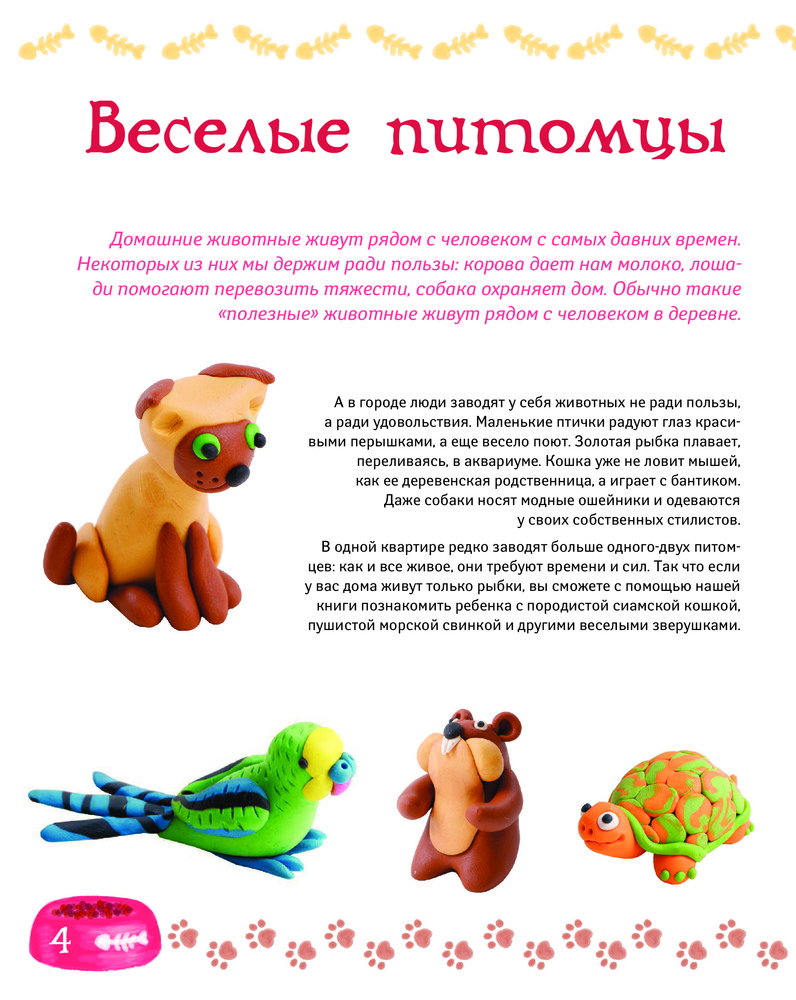 Книга очень понравилась, отличное качество исполнения. Книга большая, текст и картинки крупные и подробные. Поэтому подойдет как для совместной работы ребенка и взрослого, так и для самостоятельной работы (для детей постарше). В книге дано подробное описание, как слепить из простых элементов таких как шарики и колбаски замечательные фигуры животных. Очень увлекательная книга. Понравиться как детям, так и взрослым.