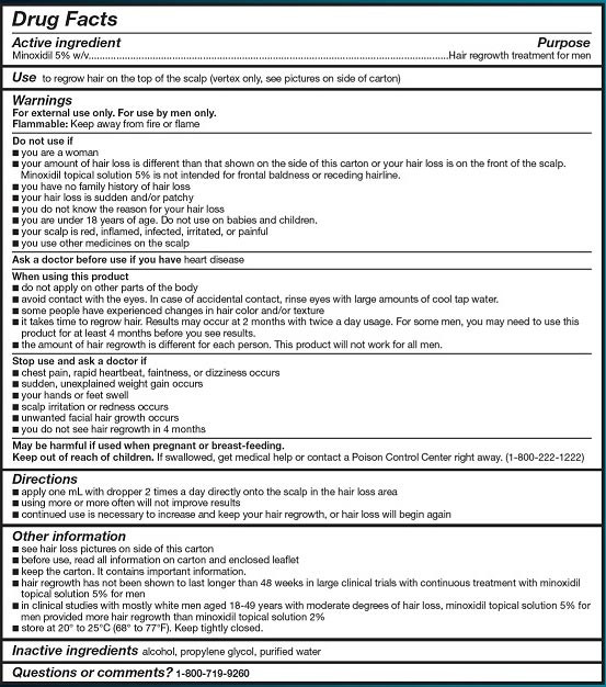 Миноксидил 5% раствор предназначен только для наружного применения. Миноксидил, 5% раствор, применяется для лечения андрогенетической алопеции только у мужчин. Это лечение предназначено для пациентов, у которых применение 2% раствора в течение 4-х месяцев не обеспечивает восстановление роста волос.