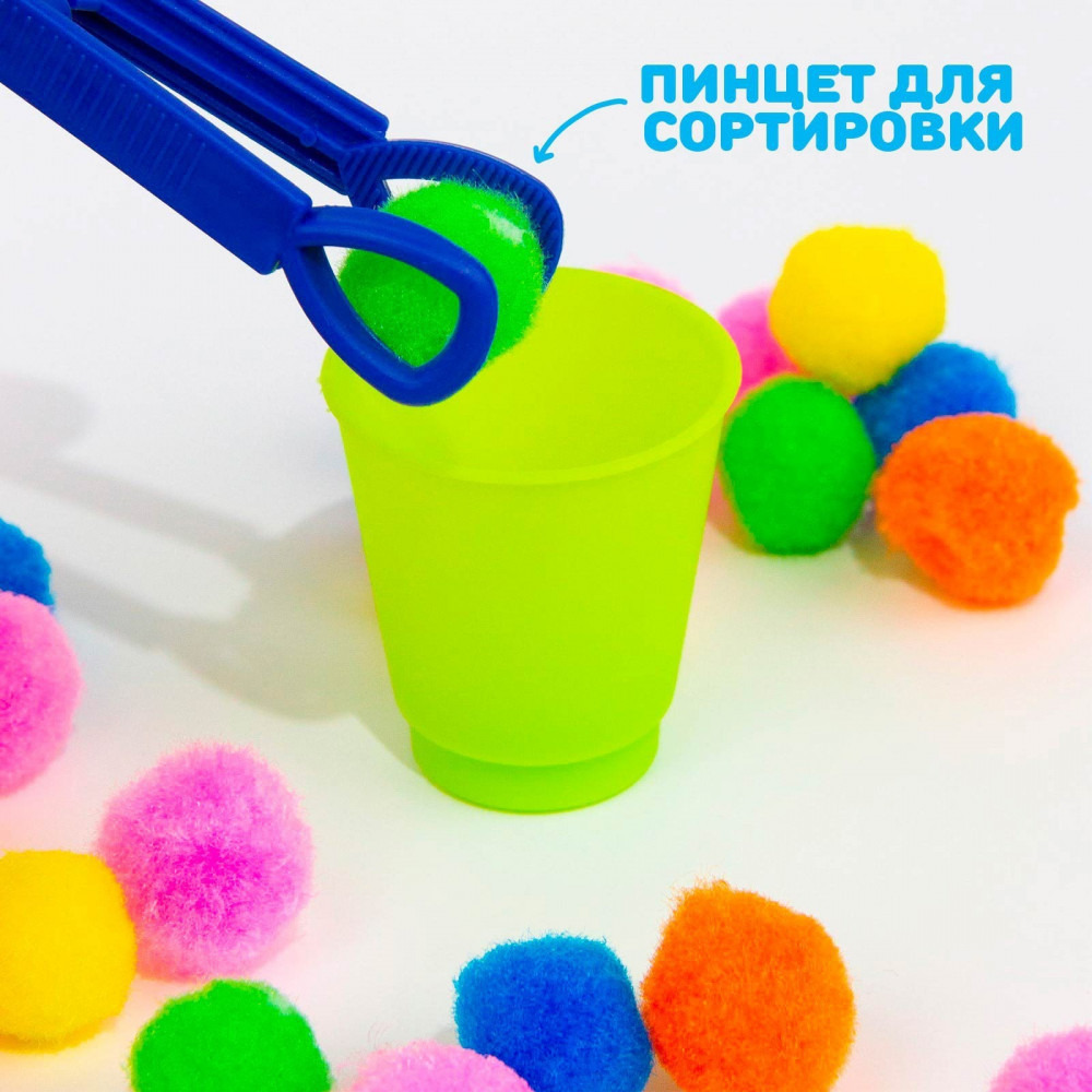 Iq-zabiaka Набор для сортировки с пинцетом по методике Монтессори «Сортер-стаканчики: Цветные бомбошки»+17