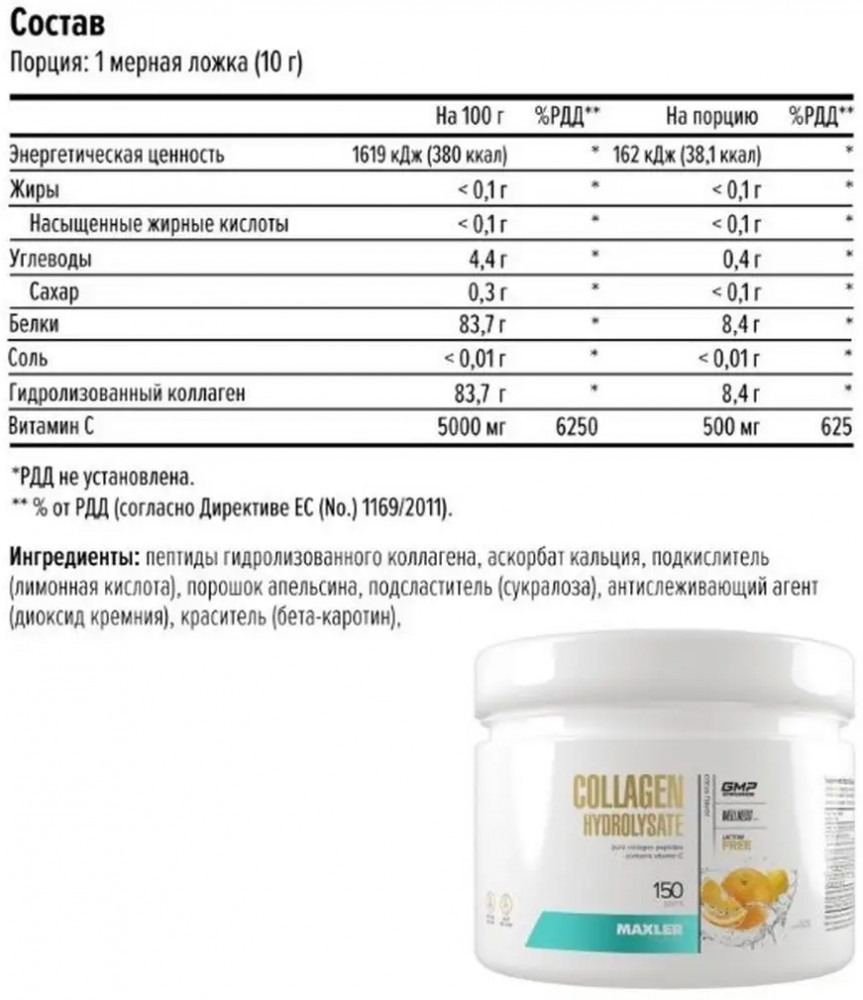 Пептиды гидролизованного коллагена, аскорбат кальция, подкислитель (лимонная кислота), порошок апельсина, подсластитель (сукралоза), антислеживающий агент (диоксид кремния), краситель (бета-каротин).