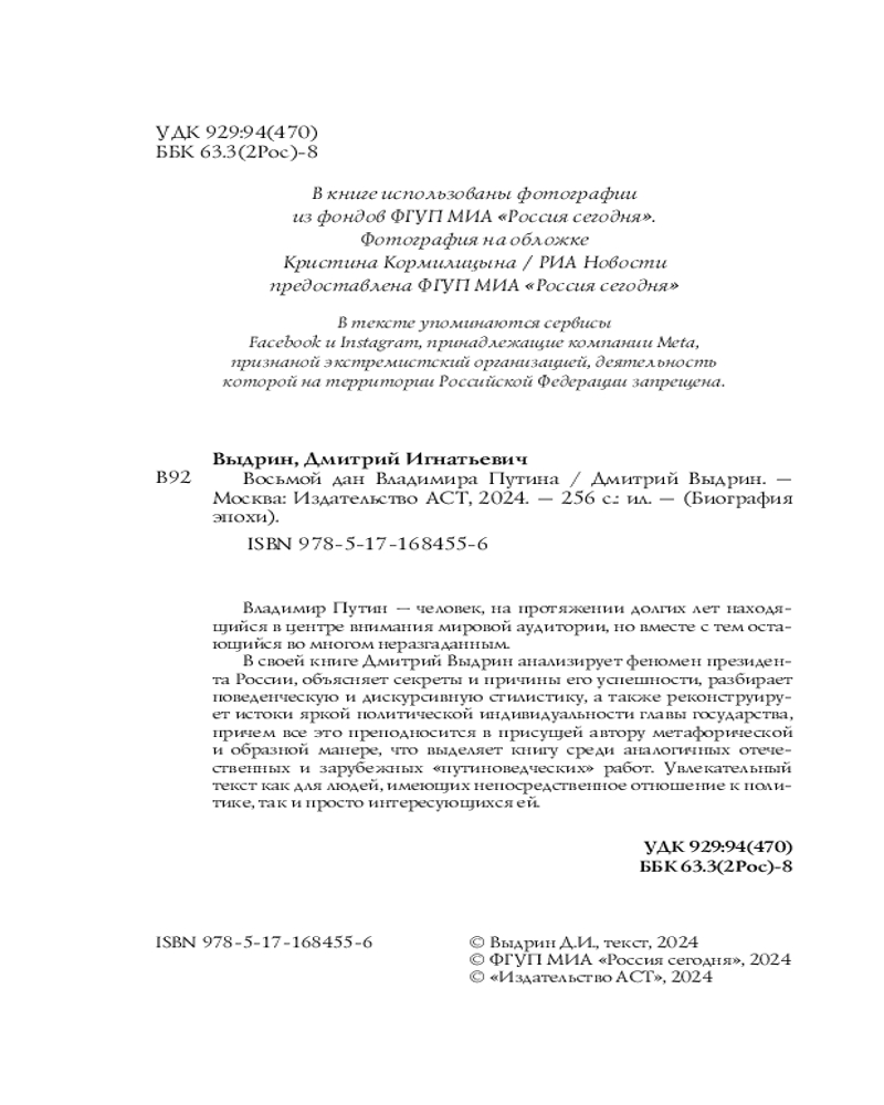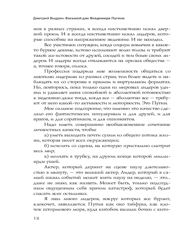 💳 Оплатить за товар можно при получении 🇰🇿 Есть бесплатная доставка по Казахстану от 1 дня 🎁 Копите бонусы с каждой покупки Серия: Биография эпохи Владимир Путин — человек, на протяжении долгих лет находящийся в центре внимания мировой аудитории, но вместе с тем остающийся во многом неразгаданным. В своей книге Дмитрий Выдрин анализирует феномен президен- та России, объясняет секреты и причины его успешности, разбирает поведенческую и дискурсивную стилистику, а также реконструирует истоки яркой политической индивидуальности главы государства, причем все это преподносится в присущей автору метафорической и образной манере, что выделяет книгу среди аналогичных отечественных и зарубежных «путиноведческих» работ. Увлекательный текст как для людей, имеющих непосредственное отношение к политике, так и просто интересующихся ей. |